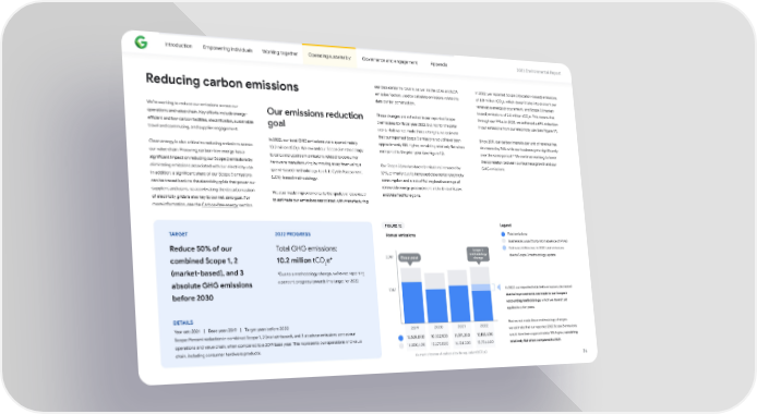 Introduction Empowering individuals Working together Operating sustainably Governance and engagement Appendix 2023 Environmental Repo爀琀 our data center hardware, as well as the LCAs and LCA In 2022, we repo爀琀ed Scope 2 (location-based) emissions Reducing carbon emissions emission factors used to calculate emissions related to of 8.0 million tCO e, which doesn’t take into account our 2 data center construction. renewable energy procurement, and Scope 2 (market- based) emissions of 2.5 million tCO e. This means that 2 We’re working to reduce our emissions across our Our emissions reduction These changes are re昀氀ected in our repo爀琀ed Scope through our PPAs, in 2022, we achieved a 69% reduction operations and value chain. Key e昀昀o爀琀s include energy- 3 emissions for 昀椀scal year 2022, but not for the prior in our emissions from our electricity use (see Figure 17). e昀케cient and low-carbon facilities, electri昀椀cation, sustainable goal years. Had we not made these changes, we estimate travel and commuting, and supplier engagement. that our repo爀琀ed Scope 3 emissions would have been Since 2011, our carbon intensity per unit of revenue has In 2022, our total GHG emissions were approximately approximately 18% higher, remaining relatively 昀氀at when decreased by 76% while our business grew signi昀椀cantly Clean energy is also critical to reducing emissions across 69 10.2 million tCO e. We revised our Scope 3 methodology compared to the prior year (see Figure 12). over the same period. We continue working to lower 2 our value chain. Procuring carbon-free energy has a to calculate upstream emissions related to consumer the correlation between our business growth and our signi昀椀cant impact on reducing our Scope 2 emissions by hardware manufacturing by moving away from using a Our Scope 2 (market-based) emissions increased by GHG emissions. eliminating emissions associated with our electricity use. spend-based methodology to a Life Cycle Assessment 37%, primarily due to increased data center electricity In addition, a signi昀椀cant share of our Scope 3 emissions (LCA)-based methodology. consumption and a lack of full regional coverage of can be traced back to the electricity grids that power our renewable energy procurement in the United States suppliers and users, so accelerating the decarbonization We also made improvements to the quality of data used and Asia Paci昀椀c regions. of electricity grids is also key to our net-zero goal. For to estimate our emissions associated with manufacturing more information, see the Carbon-free energy section. FIGURE 12 Legend Total emissions TARGET 2022 PROGRESS Annual emissions Business as usual (footprint in absence of PPAs) Estimated di昀昀erence in 2022 total emissions Reduce 50% of our Total GHG emissions: Scope 3 methodology combined Scope 1, 2 10.2 million tCO e* 20M Base year change due to Scope 3 methodology update 2 (market-based), and 3 *Due to a methodology change, we’re not repo爀琀ing absolute GHG emissions a percent progress towards this target for 2022 10M In 2022, our repo爀琀ed total GHG emissions decreased before 2030 due to improvements we made to our Scope 3 accounting methodology, which we haven’t yet applied to prior years. DETAILS Had we not made these methodology changes, Year set: 2021 | Base year: 2019 | Target year: before 2030 2019 2020 2021 2022 we estimate that our repo爀琀ed 2022 Scope 3 emissions Scope: Percent reduction in combined Scope 1, 2 (market-based), and 3 absolute emissions across our 12,528,000 10,322,100 11,371,200 10,183,400 would have been approximately 18% higher, remaining operations and value chain, when compared to a 2019 base year. This represents our operations and value 16,850,600 15,275,800 16,124,300 15,736,600 relatively 昀氀at when compared to 2021. chain, including consumer hardware products. (in metric tonnes of carbon dioxide equivalent [tCOe]) 2 36