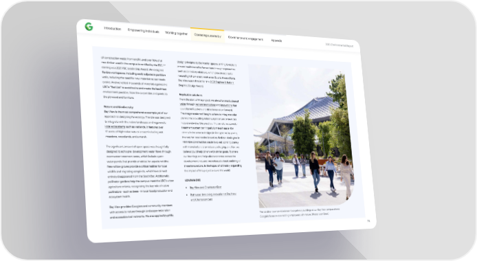 Introduction Empowering individuals Working together Operating sustainably Governance and engagement Appendix 2023 Environmental Repo爀琀 of construction waste from land昀椀ll, and over 96% of all design principles to the interior spaces, aiming to capture 142 new timber used in the campus is ce爀琀i昀椀ed by the FSC, proven health bene昀椀ts for workers through approaches earning us a 2021 FSC Leadership Award. We designed such as clerestory windows, which provide access to 昀氀exible workspaces, including easily adjustable pa爀琀ition natural light from every work area. Due to these e昀昀o爀琀s, walls, reducing the need for new materials as our needs Bay View was a 昀椀nalist for the 2023 Stephen R. Kelle爀琀 evolve. And we ve琀琀ed thousands of materials against the Biophilic Design Award. LBC’s “Red List” to avoid toxins and create the healthiest environment possible, from the carpet tiles and paints to Replicable solutions the plywood and furniture. From the sta爀琀 of this project, we aimed to create shared value through replicable solutions and innovations that Nature and biodiversity could bene昀椀t others and drive innovation forward. Bay View is the most comprehensive example yet of our The dragonscale roof taught us how to integrate solar approach to designing for ecology. The site was designed panels into a building skin in ways that we believe can to integrate with the native landscape and regenerate help standardize this practice. The on-site wastewater local ecosystems such as wetlands. It features over treatment system can hopefully make it easier for 17 acres of high-value natural areas—including wet others in the area to design similar systems by paving meadows, woodlands, and a marsh. the way for local codes to evolve. And our strategies to minimize construction waste involved working closely The signi昀椀cant amount of open space was though琀昀ully with manufacturers to reduce packaging, an e昀昀o爀琀 we designed to echo pre-development water 昀氀ows through believe could help others with similar goals. To share stormwater treatment areas, which include open- our learnings and help raise awareness across the water ponds that provide a habitat for aquatic wildlife. development industry, we released a book outlining all New willow groves provide a critical habitat for local these innovations, in the hopes of ultimately expanding wildlife and migrating songbirds, which have almost the impact of this project around the world. entirely disappeared from the South Bay. Additionally, pollinator gardens help the campus meet the LBC’s urban LEARN MORE agriculture criteria, recognizing the key role of native • Bay View and Charleston East pollinators—such as bees—in local food production and ecosystem health. • Pathways: Unlocking innovation at Bay View and Charleston East Bay View provides Googlers and community members with access to nature through landscape restoration The outdoor cou爀琀yard between two primary buildings at our Bay View campus shows and accessible trail networks. We also applied biophilic Google’s focus on connecting employees with nature. (Photo: Iwan Baan) 74