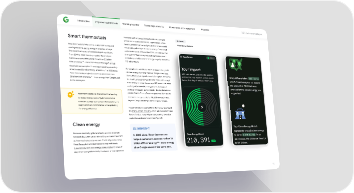 Introduction Empowering individuals Working together Operating sustainably Governance and engagement Appendix 2023 Environmental Repo爀琀 Features such as Energy Shi昀琀 gather local power grid FIGURE 3 Sma爀琀 thermostats emissions forecasts and identify oppo爀琀unities where Nest Renew features heating or cooling a home slightly earlier or later would Nest thermostats help control residential heating and mean taking advantage of cleaner energy. These small cooling systems, saving energy in a variety of ways. actions add up; as of December 2022, we estimate that The collective impact of these savings is signi昀椀cant. 32 33 Energy Shi昀琀 has already helped Nest Renew users From 2011 to 2022, Nest thermostats have helped collectively prioritize cleaner energy usage for more than customers cumulatively save more than 113 billion 110 million hours. 28 kWh of energy —more than double Po爀琀ugal’s annual 29 electricity consumption —and equivalent to preventing For people who want to do more to suppo爀琀 the growth 30 an estimated 36 million tCO e emissions. In 2022 alone, 2 of clean energy from their homes, Google o昀昀ers Nest Nest thermostats helped customers save more than Renew Premium as a paid subscription option. It matches 31 26 billion kWh of energy —more energy than Google used the fossil fuel electricity used in their home with enough in the same year. clean energy to cover the average U.S. household. We’re working with renewable energy plants that suppo爀琀 projects in Google’s own po爀琀folio—like the Bethel Wind plant in Castro County, Texas—to purchase high-quality Nest thermostats use AI and machine learning renewable energy credits for Nest Renew customers, to reduce energy consumption and achieve beyond Google’s existing clean energy purchases. collective savings as they learn how and when to keep customers comfo爀琀able, while optimizing People can also access features like impact repo爀琀s and for energy e昀케ciency. the Energy Impact Program, which lets them direct Nest Renew funds to nonpro昀椀t pa爀琀ners working toward an equitable sustainable future (see Figure 3). Clean energy 2022 HIGHLIGHT Because electricity grids tend to be cleaner at ce爀琀ain times of day, when we use electricity can be as impo爀琀ant In 2022 alone, Nest thermostats as how much electricity we use. That’s why we launched helped customers save more than 26 34 Nest Renew in the United States to help individuals billion kWh of energy —more energy automatically shi昀琀 their energy consumption to times of than Google used in the same year. day when local grid electricity is cleaner or less expensive 15