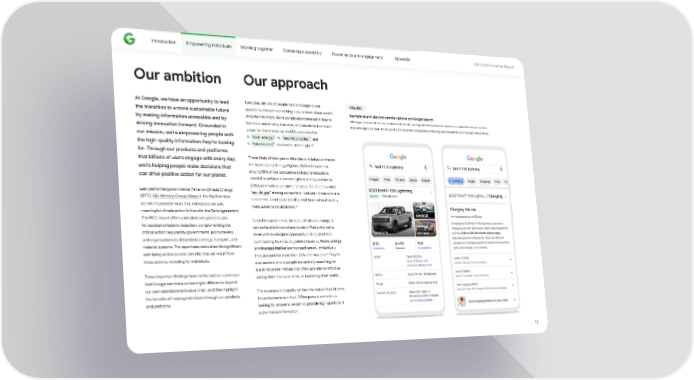 Introduction Empowering individuals Working together Operating sustainably Governance and engagement Appendix 2023 Environmental Repo爀琀 Our ambition Our approach Every day, billions of people turn to Google to ask FIGURE 1 At Google, we have an oppo爀琀unity to lead the transition to a more sustainable future questions, discover something new, or learn about what’s See hybrid and electric vehicle options on Google Search by making information accessible and by impo爀琀ant to them. More people are interested in how to When people search for car models and brands, we tag hybrid and electric options to make them easier to 昀椀nd. live more sustainably than ever, and our aim is to make it driving innovation forward. Grounded in And when people look into a speci昀椀c EV, we show compatible charging stations nearby and typical charge times. easier for them to do so. In 2022, searches for our mission, we’re empowering people with “solar energy,” “electric bicycles,” and the high-quality information they’re looking “electric cars” reached all-time highs. 23 for. Through our products and pla琀昀orms that billions of users engage with every day, These kinds of changes to lifestyles and behavior ma琀琀er: we’re helping people make decisions that the International Energy Agency (IEA) estimates that can drive positive action for our planet. around 55% of the cumulative emissions reductions needed to achieve a net-zero global energy system by 2050 are linked to consumer choices. Yet, there’s a wide Last year’s Intergovernmental Panel on Climate Change “say-do gap” among consumers—between those who are (IPCC) AR6 Working Group 3 Repo爀琀, for the 昀椀rst time, concerned about sustainability, and those who ultimately set out measurable ways that individuals can take 24 make sustainable decisions. meaningful climate action in line with the Paris Agreement. The IPCC repo爀琀 o昀昀ers a detailed and practical plan To tackle a problem at the scale of climate change, it for societal emissions reduction, complementing the can be hard to know where to sta爀琀. That’s why we’ve critical action required by governments, policymakers, taken a 昀椀rst-principles approach, looking at what’s and organizations to decarbonize energy, transpo爀琀, and contributing the most to global emissions. Home energy material systems. The repo爀琀 also calculates the signi昀椀cant and transpo爀琀ation are two such areas—collectively well-being and economic bene昀椀ts that will result from 25 they account for more than 20% of emissions. They’re these actions, including for individuals. also sectors where people are actively searching for sustainable alternatives that o昀琀en provide bene昀椀ts like These impo爀琀ant 昀椀ndings have reinforced our conviction saving them money or time, or improving their health. that Google can make a meaningful di昀昀erence beyond our own operations and value chain, and they highlight The accuracy and quality of the information that informs the bene昀椀ts of helping individuals through our products these decisions is critical. When people come to us and pla琀昀orms. looking for answers, we aim to provide high-quality and authoritative information. 13