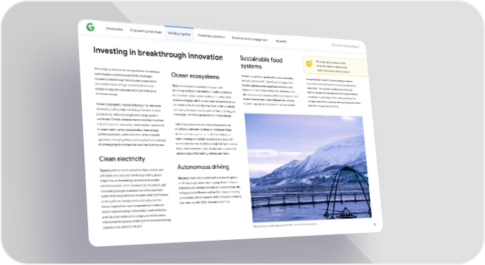 Introduction Empowering individuals Working together Operating sustainably Governance and engagement Appendix 2023 Environmental Repo爀琀 Investing in breakthrough innovation Sustainable food Mineral is using robotics, AI, and computer vision to create a more systems sustainable food production system. food production system. It’s developing perception- Increasing agricultural productivity and sustainability We’re helping advance the next generation of audacious Ocean ecosystems powered solutions with pa爀琀ners across the agriculture is imperative to feed the planet’s growing population. technologies to address sustainability challenges. value chain—from grocery retailers and enterprise Incubating breakthrough technologies is essential for Modern agriculture has a signi昀椀cant environmental Tidal is X’s moonshot to protect the ocean with farms to equipment manufacturers and crop protection impact, such as soil degradation and biodiversity loss the transformative change needed to deliver deep technology systems while feeding humanity sustainably. companies—to develop a be琀琀er understanding of the emissions reductions at scale and to bend the curve due to weeds, pests, diseases, herbicide resistance, and Its underwater sensor system and machine perception excess chemical input waste. Mineral uses robotics, complex interactions of plants, their growing environment, of climate change. tools are bringing visibility to our ocean ecosystems so we and farm management practices. AI, and computer vision to create a more sustainable can be琀琀er understand and protect them while sustainably And at X, Alphabet’s “moonshot factory,” our teams are harnessing the ocean to solve some of humanity’s biggest developing cu琀琀ing-edge technology that aims to solve challenges—from food production to climate change. problems for millions of people and change systems worldwide. Climate-related projects comprise more than Tidal’s 昀椀rst product monitors 昀椀sh and environmental half of X’s current moonshots, which include experiments conditions underwater to detect and interpret things in ocean health, carbon sequestration, clean energy, like 昀椀sh behaviors, which are helpful for feeding and wild昀椀re awareness, waste reduction, and sustainable health tracking, and predict outcomes such as growth agriculture. X is using what they’ve learned from a decade trends over time—all of which can help 昀椀sh farmers make of climate projects to shape the work they’re doing now. be琀琀er, more environmentally-friendly and cost-e昀昀ective decisions about 昀椀sh feeding, welfare, and health. Clean electricity Tapestry aims to unlock access to clean, reliable, and Autonomous driving a昀昀ordable electricity worldwide by providing greater Waymo’s mission is to make it safe and easy for people insight into our increasingly dynamic and complex and things to get where they’re going. Waymo’s 昀氀eet of electricity system. As X’s moonshot for the electric grid, shared electric vehicles provides a fully autonomous ride- it’s creating a single vi爀琀ualized view of the electricity hailing service in Phoenix and San Francisco, connecting system that can predict and simulate what might happen communities with the bene昀椀ts of EVs. Waymo’s EV 昀氀eet is on the grid from nanoseconds to decades into the also matched with 100% renewable electricity. future. Insights from such computational models can lead to reduced energy consumption, lower emissions, and improved resilience to outages, as well as reduce interconnection queues, enabling more renewable energy capacity to be added to the grid. Tidal testing its technology at a 昀椀sh farm no爀琀h of the Arctic Circle. 28