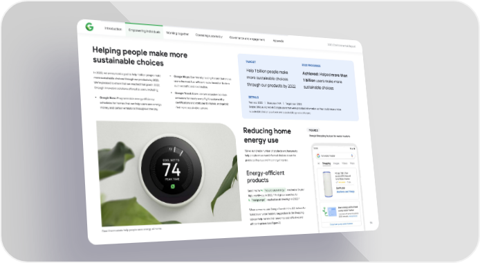 Introduction Empowering individuals Working together Operating sustainably Governance and engagement Appendix 2023 Environmental Repo爀琀 Helping people make more TARGET 2022 PROGRESS sustainable choices Help 1 billion people make Achieved: Helped more than more sustainable choices 1 billion users make more In 2020, we announced a goal to help 1 billion people make • Google Maps: Eco-friendly routing feature that shows more sustainable choices through our products by 2022. users the most fuel-e昀케cient route, based on factors through our products by 2022 sustainable choices We’re pleased to share that we reached that goal in 2022, such as tra昀케c and road incline. through innovative solutions o昀昀ered to users, including: • Google Travel: Users can see associated carbon DETAILS • Google Nest: Programmable energy e昀케ciency emissions for nearly every 昀氀ight, sustainability Year set: 2020 | Base year: N/A | Target year: 2022 ce爀琀i昀椀cations and a琀琀ributes for hotels, and quickly Scope: Unique, signed-in Google users that were provided information so they could make a more schedules for homes that can help users save energy, 昀椀nd more sustainable options. sustainable choice by at least one sustainability product feature. money, and carbon emissions throughout the day. Reducing home FIGURE 2 energy use Google Shopping feature for water heaters We’ve launched a number of products and features to help people make more informed choices about the products they buy and the energy they use. Energy-e昀케cient products Searches for “how to save energy” reached a 10-year 26 high, worldwide, in 2022. And global searches for 27 “heat pumps” reached an all-time high in 2022. When someone uses Google Search in the U.S. to look for furnaces or water heaters, suggestions in the Shopping tab can help narrow their search to cost-e昀昀ective and e昀케cient options (see Figure 2). Nest thermostats help people save energy at home. 14