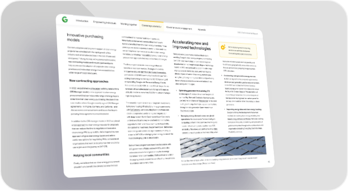 Introduction Empowering individuals Working together Operating sustainably Governance and engagement Appendix 2023 Environmental Repo爀琀 communities that host our facilities—in pa爀琀icular, Innovative purchasing historically underserved communities that haven’t Accelerating new and We’re deploying machine learning models typically bene昀椀ted from the clean energy transition. Three improved technologies solutions to optimize wind power years ago, we sta爀琀ed a journey to be琀琀er understand how forecasting and project economics. Our early adoption and long-term suppo爀琀 of clean energy we can help lower barriers to an equitable clean energy Wind and solar power have played a critical role in projects has coincided with the rapid growth of the transition, culminating in two additions to our clean energy enabling Google’s clean energy progress, but meeting local solar and wind power are most plentiful, and industry and remarkable declines in the cost of solar and procurement approach that respond to those challenges. 24/7 CFE—and maximizing our contribution to global 92 to shi昀琀 tasks geographically across data centers so wind power. Along the way, we’ve pioneered innovative decarbonization—will require expanding our technology that we can do more computing in regions where new contracting models and industry pa爀琀nerships to The 昀椀rst program extends clean energy’s 昀椀nancial toolkit. In 2022, we continued to work on a wide range CFE is abundant. help accelerate the adoption of corporate clean energy bene昀椀ts to local communities. Through a 昀椀rst-of-its- of projects to demonstrate, scale, and maximize the practices and make clean energy more accessible to a kind pa爀琀nership with EDPR NA Distributed Generation, climate impact of carbon-free energy technologies, • Accelerating next generation energy sources: wider range of corporate buyers. we’ll create a 500 MW community-based solar po爀琀folio, using Google’s engineering capabilities and purchasing In 2021, we signed the 昀椀rst corporate agreement to adding clean energy to the regional U.S. PJM power grid demand to accelerate the commercialization of new develop a next-generation geothermal power project, New contracting approaches and providing Google with Renewable Energy Credits clean energy technologies: and in 2022, we installed the 昀椀rst-ever ba琀琀ery- that contribute to 24/7 CFE. At least 10% of the po爀琀folio’s based backup power system for a data center at our revenues will be redirected annually for up to 15 years as In 2022, we published a white paper outlining details of the Optimizing generation from existing CFE • facility in St. Ghislain, Belgium. This application will CFE Manager model, a new approach to clean energy utility bill credits to more than 25,000 households facing a technologies: To reduce the carbon footprint of enable Google to optimize the carbon footprint of high energy burden. procurement that can help a wide range of energy buyers our new Bay View and Charleston East campuses, backup power, buying local, low-carbon power for streamline their clean energy purchasing. We share three we designed and installed “dragonscale,” a new solar backup when available rather than relying on diesel The second program aims to spur long-term investments case studies where Google recently signed CFE Manager roo昀椀ng technology that helps us power our facilities generators. to improve housing infrastructure. Through a pa爀琀nership agreements—in Virginia, Germany, and California—and through on-site generation. Learn more in our • Improving energy data and clean energy tracking: with Sol Systems, we’re providing funding to three rural discuss some contractual terms and issues that buyers Bay View spotlight. Google is driving the development of advanced electric cooperatives and one regional organization pursuing these agreements should consider. Managing energy demand across our global • methods for tracking clean energy, including time- with deep roots in No爀琀h Carolina and South Carolina to operations: We developed a “carbon-intelligent based energy a琀琀ribute ce爀琀i昀椀cates. We’re also working unde爀琀ake critical home pre-weatherization and safety In addition to the CFE manager model, in 2022 we piloted computing pla琀昀orm” that optimizes the timing and to improve the quality, consistency, and granularity of upgrades for low- and moderate-income households. a new approach to clean energy requests for proposals location of computing tasks based on local CFE grid electricity data through active collaborations with Alongside this investment, the pa爀琀nership will deliver new that can reduce the time to negotiate and execute a availability. This allows us to shi昀琀 some of our data organizations including EnergyTag, Electricity Maps, solar energy and ba琀琀ery storage resources, moving us clean energy PPA by up to 80%. We’re hopeful this new centers’ computing tasks to the times of day when FlexiDAO, and more. closer to 24/7 CFE and bringing clean energy to one of the approach will give clean energy buyers and sellers most challenging grids to decarbonize. useful new options for negotiating PPAs, and enable all organizations that want to decarbonize their electricity Both of these programs are based on discussions with use to join us on the journey to 24/7 CFE. U.S. government o昀케cials, national NGOs, and policy Helping local communities advocates about challenges to an equitable energy transition in their communities. We’ll continue to build on these programs to extend the bene昀椀ts of our investments Finally, we believe that our clean energy procurement For our Bay View campus, a 昀椀rst-of-its-kind building-integrated solar panel called “dragonscale” was developed to underserved communities. shouldn’t only bene昀椀t the climate, but also the local to create a seamless 