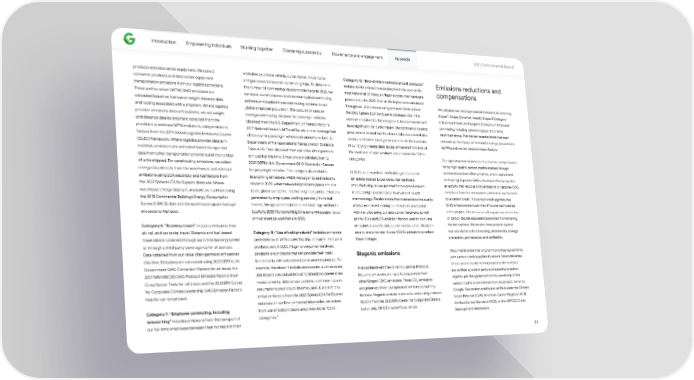 Introduction Empowering individuals Working together Operating sustainably Governance and engagement Appendix 2023 Environmental Repo爀琀 products and data center equipment. We collect worksites by private vehicle, public transit, motorcycle, Category 12: “End-of-life treatment of sold products” Emissions reductions and consumer products and data center equipment and gas-powered scooter commuting trips. To determine includes GHG emissions associated with the end-of-life compensations transpo爀琀ation emissions from our logistics providers. the number of commuting trips by mode made in 2022, we treatment of all of Google’s 昀氀agship consumer hardware These well-to-wheel (WTW) GHG emissions are surveyed our employees to determine typical commuting products sold in 2022. End-of-life impact was calculated We calculate our total operational emissions by summing calculated based on fuel use or weight-distance data pa琀琀erns and applied these commuting pa琀琀erns to our through our LCA process using emission factors from Scope 1, Scope 2 (market-based), Scope 3 (Category and routing associated with a shipment. Where logistics global employee population. The calculation uses an the 2022 Sphera LCA for Expe爀琀s database. Our initial 6: Business travel), and Scope 3 (Category 7: Employee provider emissions data isn’t available, we use weight average commuting distance for passenger vehicles assessments identify this category to be one that doesn’t commuting, including teleworking), per the criteria and distance data by shipment collected from the obtained from the U.S. Depa爀琀ment of Transpo爀琀ation’s have signi昀椀cant life-cycle impact. We continue to develop described above. This market-based subtotal has been providers to estimate WTW emissions, using emissions 2017 National Household Travel Survey and an average fuel programs to extend the life of our sold products and also reduced by the impact of renewable energy procurement factors from the 2019 Global Logistics Emissions Council e昀케ciency for passenger vehicles obtained from the U.S. to ensure e昀케cient management of end-of-life materials. via PPAs and market-based emission factors. (GLEC) framework. Where logistics provider data isn’t Depa爀琀ment of Transpo爀琀ation’s Transpo爀琀ation Statistics In our Environmental data tables, emissions from end-of- available, emissions are estimated based on repo爀琀ed Table 4–23. Data obtained from our value chain pa爀琀ners life treatment of sold products are presented in “Other Our operational emissions are then fu爀琀her compensated data from other transpo爀琀ation providers and the number isn’t used at this time. Emissions are calculated using categories.” for by high-quality carbon credits enabled through of units shipped. For warehousing emissions, we collect 2022 DEFRA U.K. Government GHG Conversion Factors contracted carbon o昀昀set projects, which capture and energy data directly from the warehouses and estimate for passenger vehicles. This category also includes In 2022, we revised our methodology to calculate destroy highly potent GHGs. A carbon o昀昀set project is emissions using LCA electricity and fuel factors from teleworking emissions, which we began to estimate and emissions related to our consumer hardware an activity that reduces GHG emissions or captures GHG the 2022 Sphera LCA for Expe爀琀s database. Where repo爀琀 in 2020, when teleworking became prevalent due manufacturing, as we updated from a spend-based emissions from the atmosphere, ultimately represented warehouse energy data isn’t available, we estimate using to the global pandemic. Teleworking represents emissions methodology to a Life Cycle Assessment-based by a carbon credit. The carbon credit signi昀椀es that the 2018 Commercial Buildings Energy Consumption generated by employees working remotely from their methodology. We also made improvements to the quality GHG emissions are lower than if no one had invested Survey (CBECS) data and the warehouse square footage homes. We apply the estimation methodology outlined in of data used in estimating our emissions associated in the project. One carbon credit equals one metric ton allocated to Alphabet. EcoAct’s 2020 Homeworking Emissions white paper to our with manufacturing our data center hardware, as well of carbon dioxide equivalent prevented from entering annual average workforce in 2022. as the LCAs and LCA emission factors used to calculate Category 6: “Business travel” includes emissions from emissions related to data center construction. We didn’t the atmosphere. We assess these projects against four standards before investing: additionality, leakage air, rail, and car rental travel. Distance and fuel-based Category 11: “Use of sold products” includes emissions recalculate prior year Scope 3 GHG emissions to re昀氀ect prevention, permanence, and veri昀椀ability. travel data is collected through our online booking system generated by all of Google’s 昀氀agship consumer hardware these changes. or through a third-pa爀琀y travel agency for all sources. products sold in 2022. Flagship consumer hardware We primarily enter into long-term purchase agreements Data obtained from our value chain pa爀琀ners isn’t used at products are products that can provide their main Biogenic emissions with carbon credit suppliers to secure future deliveries. this time. Emissions are calculated using 2022 DEFRA U.K. functionality without connection to another product. For Once carbon credits from a project under contract Government GHG Conversion Factors for air travel, the example, this doesn’t include accessories, such as cases. In accordance with the Greenhouse Gas Protocol, are veri昀椀ed by a third-pa爀琀y and issued by a carbon 2017 WRI/WBCSD GHG Protocol Emission Factors from Use impact was calculated using laboratory power draw biogenic emissions are repo爀琀ed separatel