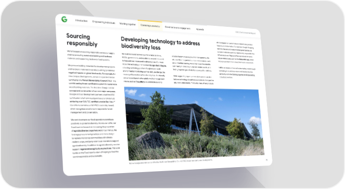 Introduction Empowering individuals Working together Operating sustainably Governance and engagement Appendix 2023 Environmental Repo爀琀 aim to engage our users in nature-related tools, product Sourcing Developing technology to address features, and information. For example, Google Shopping restricts the sale and trade of endangered species via responsibly biodiversity loss content moderation policies. Additionally, we provide free API access to our Maps and Places products for some nature-related uses, such as the iNaturalist app, which We’re focused on sourcing responsibly across our supply We build tools and technology that enable pa爀琀ners, solution that improves supply chain transparency. We helps people learn more about their local environment. chain by procuring sustainable building and hardware NGOs, governments, and academics around the world also use AI to help pa爀琀ners unlock new advances, such materials and suppo爀琀ing biodiverse food systems. to help address nature and biodiversity loss. Our most as our machine learning model that helps the scienti昀椀c Additional details on how we’re developing breakthrough impac琀昀ul technology in this area is Google Ea爀琀h Engine, community in detecting humpback whale sounds, or in technologies to address nature and biodiversity loss We procure building materials for development projects a leading technology pla琀昀orm for planetary-scale 昀椀nding hopeful signs of wildlife recovery a昀琀er wild昀椀res. can be found in the Working together and Empowering and hardware materials for products aiming to minimize environmental monitoring such as land use change, the individuals sections. negative impacts on global biodiversity. For example, for most signi昀椀cant driver of biodiversity loss. Additionally, While suppo爀琀ing expe爀琀 pa爀琀ners is impo爀琀ant, we also new campus developments, we’ve incorporated timber we’ve helped launch other pla琀昀orms that help protect believe technology should help everyone do their pa爀琀 for ce爀琀i昀椀ed by the Forest Stewardship Council (FSC)—the nature, such as TraceMark, a sustainable sourcing nature and biodiversity. That’s why many of our products world’s leading forest ce爀琀i昀椀cation system for sustainable wood building materials. The 昀椀rst time Google led the concept and construction of our own major campuses, Google and our development pa爀琀ners prioritized FSC ce爀琀i昀椀cation of all new wood purchased and installed, achieving over 96% FSC-ce爀琀i昀椀ed wood at Bay View. 141 Our e昀昀o爀琀s earned us a 2021 FSC Leadership Award, which recognizes excellence in responsible forest management and conservation. We work to ensure our food operations contribute positively to global biodiversity. Across our cafes, our Food team is focused on increasing the propo爀琀ion of agrobiodiverse crops featured on our menus. We leverage procurement practices and menu design to replace monocrop commodities with climate- resilient crops, and jump-sta爀琀 local markets to suppo爀琀 agrobiodiversity. In addition to agrobiodiversity, we also suppo爀琀 regenerative agriculture practices. This work builds on the Food team’s vision of helping to feed the world responsibly and sustainably. We’ve incorporated timber ce爀琀i昀椀ed by the Forest Stewardship Council (FSC) in our new campuses developments. 71