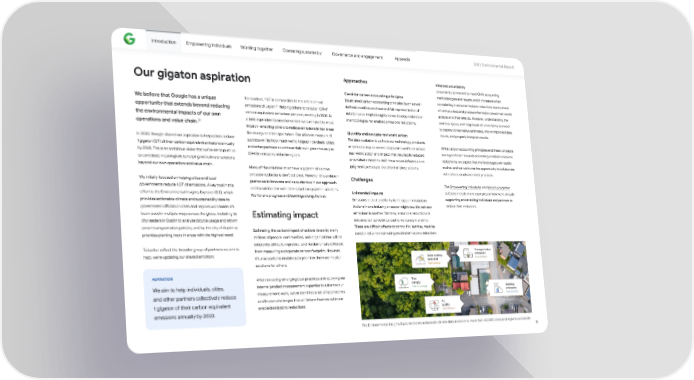 Introduction Empowering individuals Working together Operating sustainably Governance and engagement Appendix 2023 Environmental Repo爀琀 Approaches Inherent unce爀琀ainty Our gigaton aspiration Unce爀琀ainty is inherent to most GHG accounting Consider carbon accounting principles methodologies and results, and it increases when considering enabled emissions reductions due to a lack Established carbon accounting principles (such as well- We believe that Google has a unique For context, 1 GT is comparable to the entire annual of primary data and precise information about real-world de昀椀ned baselines and true and fair representation of 22 emissions of Japan. Helping others to reduce 1 GT of oppo爀琀unity that extends beyond reducing actions and their e昀昀ects. However, understanding the data) provide helpful insights as we develop estimation carbon equivalent emissions per year, sta爀琀ing in 2030, is the environmental impacts of our own sources, types, and magnitude of unce爀琀ainty is crucial methodologies for enabled emissions reductions. a bold aspiration focused on where we can have the most to deploy conservative estimates, inform improved data 21 operations and value chain. impact—enabling others to reduce emissions in key areas Quantify and evaluate real world action inputs, and properly interpret results. like energy and transpo爀琀ation. Our ultimate measure of The data available to us from our technology, products, In 2020, Google shared our aspiration to help others reduce success will be how much we’ve helped individuals, cities, While carbon accounting principles and these concepts or services may be several steps removed from actual, 1 gigaton (GT) of their carbon equivalent emissions annually and other pa爀琀ners to achieve their own greenhouse gas are a good sta爀琀 towards estimating enabled emissions real-world action and impact that resulted in reduced by 2030. This is an ambitious vision that we’ve set to push us (GHG) emissions reduction goals. reductions, we expect that methodologies will rapidly or avoided emissions. We’ll have to use inference and to contribute meaningfully to helping with climate solutions evolve, and we welcome the oppo爀琀unity to collaborate judgment to evaluate the e昀昀ect of those actions. beyond our own operations and value chain. Many of the solutions to achieve a gigaton of carbon with others to advance best practices. emission reductions don’t yet exist. However this ambition Challenges We initially focused on helping cities and local pushes us to innovate and be audacious in our approach The Empowering individuals and Working together governments reduce 1 GT of emissions. A key tool in this and to collaborate with others to drive systemic solutions. Unintended impacts sections include many examples of how we’re already e昀昀o爀琀 is the Environmental Insights Explorer (EIE), which We’ll share progress and learnings along the way. suppo爀琀ing and enabling individuals and pa爀琀ners to Emissions reduction e昀昀o爀琀s don’t happen in isolation. provides actionable climate and sustainability data to reduce their emissions. Actions in one industry or sector might result in net new government o昀케cials in cities and regions worldwide. It’s emissions in another. Similarly, emissions reductions in been used in multiple ways across the globe, including by Estimating impact one area can sometimes lead to increases in another. city leaders in Dublin to analyze bicycle usage and inform These are di昀케cult e昀昀ects to control for, but they must be sma爀琀 transpo爀琀ation policies, and by the city of Austin to Estimating the carbon impact of actions taken by many considered when estimating enabled emissions reductions. prioritize planting trees in areas with the highest need. millions of people, communities, and organizations will be inherently di昀케cult, imprecise, and fundamentally di昀昀erent To be琀琀er re昀氀ect the broader group of pa爀琀ners we aim to from measuring a corporate carbon footprint. However, help, we’re updating our shared ambition: it’s also useful to enable us to prioritize the most helpful solutions for others. ASPIRATION A昀琀er reviewing emerging best practices and applying our We aim to help individuals, cities, internal product measurement expe爀琀ise to advance our measurement work, we’ve identi昀椀ed a set of approaches and other pa爀琀ners collectively reduce and known challenges that will inform how we estimate 1 gigaton of their carbon equivalent enabled emissions reductions. emissions annually by 2030. The Environmental Insights Explorer makes actionable climate data available to more than 40,000 cities and regions worldwide. 11