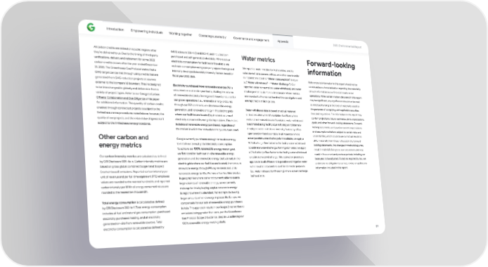 Introduction Empowering individuals Working together Operating sustainably Governance and engagement Appendix 2023 Environmental Repo爀琀 All carbon credits are retired on a public registry a昀琀er GRI Disclosure 302-1c(i) and 302-1f, and includes both Water metrics they’re delivered to us. Due to the timing of third-pa爀琀y purchased and self-generated electricity. Where actual Forward-looking veri昀椀cations, delivery and retirement for some 2022 electricity consumption for facilities isn’t available, we We repo爀琀 all water metrics for Alphabet Inc. and its carbon credits occurs a昀琀er the year ended December estimate consumption using company square footage and information subsidiaries’ data centers, o昀케ces, and other assets under 31, 2022. The Greenhouse Gas Protocol states that a internally developed electricity intensity factors based on our operational control. “Water consumption” is equal GHG target can be met through using credits that are 昀椀scal year 2022 data. References to information in this repo爀琀 should not be to (“Water withdrawal” – “Water discharge”). Our generated from GHG reduction projects at sources construed as a characterization regarding the materiality repo爀琀ed water consumption, water withdrawal, and water external to the (company’s) boundary. They’re designed Electricity purchased from renewable sources (%) is of such information to our 昀椀nancial results or our discharge metrics don’t include seawater. Water metrics to be interchangeable globally and deliverable from a calculated on a calendar-year basis, dividing the volume operations. While ce爀琀ain ma琀琀ers discussed in this repo爀琀 are rounded to the nearest hundred thousand gallons and variety of project types. Refer to our Google’s Carbon of renewable electricity (in megawa琀琀-hours) procured for may be signi昀椀cant, any signi昀椀cance should not be read are repo爀琀ed in million gallons. O昀昀sets: Collaboration and Due Diligence white paper our global operations (i.e., renewable energy procured as necessarily rising to the level of materiality used for for additional information. The quantity of carbon credits through our PPA contracts, on-site renewable energy the purposes of complying with applicable securities Water withdrawal data is based on actual metered enabled through contracted projects is subject to the generation, and renewable energy in the electric grids laws and regulations. The information in this repo爀琀 may or invoiced data when it’s available. At o昀케ces where limited assurance procedures noted above; however, the where our facilities are located) by the total volume of contain projections, future estimates, plans, expectations, metered or invoiced data isn’t available, water withdrawal quality of our projects and the related due diligence isn’t electricity consumed by our global operations. This metric goals, and other forward-looking statements. Forward- is estimated using facility square footage and internally subject to the limited assurance procedures. includes all renewable energy purchased, regardless of looking statements are based on current expectations developed water withdrawal intensity factors by o昀케ce the market in which the renewable energy was consumed. and assumptions that are subject to ce爀琀ain risks and type based on 昀椀scal year data. In all instances where unce爀琀ainties, which could cause our actual results to Other carbon and Google currently purchases enough renewable energy actual potable water discharge isn’t available, we apply a di昀昀er materially from those re昀氀ected in the forward- to match our annual global electricity consumption. 90% discharge 昀氀ow factor to the facility water withdrawal energy metrics looking statements. Any changes in methodology may To achieve our 100% renewable energy match goal, to estimate water discharge. For irrigation water, we apply result in material changes to our calculations and may a 0% discharge 昀氀ow factor to the facility water withdrawal we 昀椀rst consider both our on-site renewable energy Our carbon intensity metrics are calculated as de昀椀ned result in the current and previous periods, including our to estimate water discharge. This estimation process is generation and the renewable energy that’s already in the base year, to be adjusted. Except as required by law, we by GRI Disclosure 305-4a-c. Carbon intensity metrics are applicable to all o昀케ces and to potable and irrigation water electric grids where our facilities are located, then procure unde爀琀ake no obligation to correct, revise, or update any based on gross global combined Scope 1 and Scope 2 withdrawal at data centers used for domestic purposes renewable energy through PPA agreements and utility information included in this repo爀琀. (market-based) emissions. Repo爀琀ed carbon intensity per (i.e., water not used for IT cooling) where actual discharge renewable energy tari昀昀s. We have a few facilities located unit of revenue and per full-time equivalent (FTE) employee isn’t available. in geographies where we’re not currently able to source values are rounded to the nearest hundredth, and repo爀琀ed large volumes of renewable energy, so we currently carbon intensity per MWh of energy consumed values are make up for this by buying surplus renewable energy rounded to the nearest ten thousandth. in regions where it’s abundant. For example, by buying larger amounts of wind energy in places like Europe, we Total energy consumption is calculated as de昀椀ned compensate for our lack of renewable energy purchases by GRI Disclosure 302-1e-f. Total energy consumption in Asia. This approach results in our Scope 2 market-based includes all fuel and natural gas consumption, purchased emissions being greater than zero, per the Greenhouse electricity, purchased heating, and all electricity Gas Protocol Scope 2 Gui