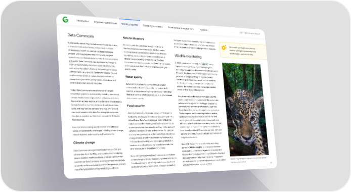 Introduction Empowering individuals Working together Operating sustainably Governance and engagement Appendix 2023 Environmental Repo爀琀 Natural disasters the highest levels of food insecurity. They can then map out Data Commons speci昀椀c food suppo爀琀 sites to see which counties will need We’re working with pa爀琀ners to leverage more civil society organizations helping with food insecurity. machine learning to monitor and protect Pa爀琀nering with the John Doerr School of Climate at Sustainability data is fragmented across thousands of silos, wildlife habitats, such as coral reefs. Stanford, Data Commons has helped Stanford create in many formats and schemas, and across a multitude of databases. In 2017, we sta爀琀ed the Data Commons a climate disaster dashboard to identify areas a昀昀ected Wildlife monitoring by wild昀椀res, wet bulb temperatures, and other natural project, which aggregates data from a wide range of disasters exacerbated by climate change. The Data sources into a uni昀椀ed database to make it more accessible In 2022, global search interest in “wildlife” nearly Commons team was able to take numerous climate models and useful. Data Commons was developed by Google to 63 64 tripled, reaching a 15-year high. We’re using our and model probabilities for future temperature ranges in organize sustainability data from hundreds of sources, technology to suppo爀琀 wildlife conservation e昀昀o爀琀s around speci昀椀c areas. such as the World Bank, National Aeronautics and Space the world. TerrAdapt uses satellite monitoring technology Administration, and the U.S. Centers for Disease Control Water quality powered by Google Ea爀琀h Engine to project habitat and Prevention (CDC). It makes this data available to conditions given future climate and land-use scenarios. researchers, journalists, policymakers, individuals, and TerrAdapt can help prioritize areas for conservation Data Commons is helping communities get a be琀琀er other stakeholders around the globe. actions—like habitat restoration, increasing protection understanding of water use, quality, and availability. For status, and building wildlife crossings. example, a researcher at the Indian Institute of Technology Today, Data Commons is one of the world’s largest Madras is working with Data Commons to add India-based knowledge graphs on sustainability, including data about Google teamed up with the Commonwealth Scienti昀椀c data on water quality. climate, health, food, crops, shelter, emissions, and more. and Industrial Research Organisation (CSIRO—Australia’s Anyone can access, explore, and understand this data using national science agency) and the Kaggle data science Google Search or our free dashboards and visualization Food security community to protect coral reefs including Australia’s tools, and they can use our open and free APIs to build Great Barrier Reef, the world’s biggest coral reef system. new tools based on this data. For enterprise customers, Feeding America is a nationwide network of 200 member We developed a machine learning solution to analyze this data is available via Data Commons on the BigQuery food banks serving tens of millions of people in need in the underwater images of a species of sta爀昀ish that feed Analytics Hub. United States. Data from their annual Map the Meal Gap on living coral. By detecting them more accurately and study is accessible in Feeding America Data Commons, so e昀케ciently, scientists can now more easily monitor the reef Data Commons is being used to monitor and address a anyone can explore food security and how it intersects with and manage the impact of the sta爀昀ish more e昀昀ectively. variety of sustainability challenges, including climate change, variables like health, climate, and education. For example, In collaboration with CSIRO and other pa爀琀ners, we’re also natural disasters, water quality, and food security. it shows that counties that will be most a昀昀ected by climate applying AI to measure carbon sequestration capacity of change are also already most a昀昀ected by food scarcity. seagrass ecosystems. Climate change This data allows Feeding America to quickly identify U.S. locations where food insecurity is most exacerbated by Since 2017, Google has been a founding technology other root causes of disparities and hardship. Data Commons can ingest health data from the CDC and pa爀琀ner in Wildlife Insights—a collaboration between climate data from the IPCC, and combine them by aligning seven leading conservation organizations to streamline Nonpro昀椀t TechSoup used Data Commons to identify how data on location, health conditions, or dates. A policymaker biodiversity monitoring with the help of AI and to 昀椀ll critical climate change will impact food security needs in California. can then use Data Commons to compare these two datasets data gaps to inform data-driven decisions. This pla琀昀orm Wildlife Insights helps conservationists protect species This allowed them to see that agricultural counties that will to identify outliers and understand how temperature changes makes it easier for conservationists and scientists to collect from extinction with AI. be most impacted by temperature changes are already at may a昀昀ect populations with pre-existing conditions. and analyze data from remote cameras. 27