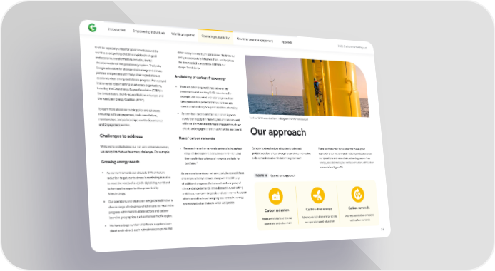 Introduction Empowering individuals Working together Operating sustainably Governance and engagement Appendix 2023 Environmental Repo爀琀 It will be especially critical for governments around the di昀昀er widely in maturity. In some cases, this limits our world to enact policies that drive rapid technological ability to successfully in昀氀uence them, and to collect and economic transformations, including the full the data needed to accurately estimate our decarbonization of the global energy system. That’s why Scope 3 emissions. Google advocates for stronger clean energy and climate policies, and pa爀琀ners with many other organizations to Availability of carbon-free energy accelerate clean energy and climate progress. We’ve played instrumental roles in se琀琀ing up advocacy organizations, • There are o昀琀en long lead times between our including the Clean Energy Buyers Association (CEBA) in investments and resulting GHG reductions. For the United States, the RE-Source Pla琀昀orm in Europe, and example, with new wind and solar projects, it can the Asia Clean Energy Coalition (ACEC). take years before projects that we contract are constructed and begin to generate clean electricity. To learn more about our public policy and advocacy, • System-level decarbonization is proceeding more No爀琀her O昀昀shore wind farm in Belgium (92 MW for Google) including policy engagement, trade associations, memberships, and pa爀琀nerships, see the Governance slowly than needed in many regions and sectors, and while we aim to accelerate these changes through our and Engagement section. e昀昀o爀琀s and engagement, they aren’t within our control. Our approach Challenges to address Use of carbon removals While we’re excited about our net-zero emissions journey, Our core business involves using data to solve hard There are three main focus areas that make up our • Because the carbon removals sector is in the earliest we recognize that we face many challenges. For example: problems, and our unique strength is combining engineering approach to our net-zero goal: reducing emissions across stage of development, costs are currently high, and skills with an innovative mindset and a global reach. our operations and value chain, advancing carbon-free there are limited volumes of removals available for Growing energy needs 68 energy, and addressing our residual emissions with carbon purchase. removals (see Figure 10). • As we work towards our absolute 50% emissions As we move towards our net-zero goal, the scale of these FIGURE 10 Our net-zero approach reduction target, our business is continuing to evolve challenges will only increase, along with the di昀케culty to meet the needs of a rapidly digitalizing world, and of additional progress. We believe that the urgency of to harness the oppo爀琀unities presented by climate change demands immediate action, and se琀琀ing AI technology. ambitious, near-term targets is a valuable way to focus our e昀昀o爀琀s and drive impo爀琀ant progress across the energy • Our operations and value chain are global and involve a systems and value chains in which we operate. diverse range of industries, which means we must make progress within hard-to-abate sectors and carbon- Carbon reduction Carbon-free energy Carbon removals intensive geographies, such as the Asia Paci昀椀c region. Reduce emissions across our Advance carbon-free energy across Address our residual emissions • We have a large number of di昀昀erent suppliers, both operations and value chain our operations and value chain with carbon removals direct and indirect, each with climate programs that 34