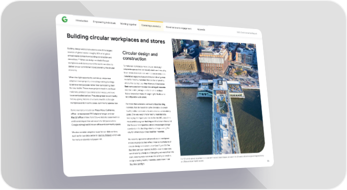 Introduction Empowering individuals Working together Operating sustainably Governance and engagement Appendix 2023 Environmental Repo爀琀 Building circular workplaces and stores Building design and construction is one of the largest Circular design and sources of global waste—roughly 30% of all global annual waste comes from building construction and construction 109 demolition. When we design and build Google workplaces and stores around the world, we strive to To make our workplaces more circular, we design deliver on our commitment to accelerating the circular adaptable spaces that can be adjusted over time using economy. fewer renovation materials, we incorporate reuse and material salvage practices, and we provide a rigorous When the right oppo爀琀unity comes up, we pursue model for healthy materials that can be adopted by adaptive reuse projects, renovating existing buildings others. For example, our Bay View and Charleston to serve a new purpose rather than demolishing them East campuses both incorporate salvaged materials for new builds. These reuse projects tend to use fewer into the building design, and both aim to reduce materials, produce less construction waste, and have future renovation waste through highly 昀氀exible and lower embodied carbon. They also preserve community recon昀椀gurable work areas. history, giving historic structures new life as Google workplaces and, in some cases, community spaces, too. For more than a decade, we’ve prioritized building materials that demonstrate safer chemistry to create Some examples include our Playa Vista, California, healthy indoor environments and advance our circularity o昀케ce—a repurposed 1943 airplane hangar, and our goals. One way we promote healthy materials is by Pier 57 o昀케ce in New York City—a historic cruise terminal leveraging third-pa爀琀y standards like the LBC, one of the and transit depot that sat vacant for 20 years before most ambitious green building ce爀琀i昀椀cations in the world. Google reimagined it into an o昀케ce and community space. Our focus on transparency aims to encourage stronger standards in the building industry at large, paving the We also consider adaptive reuse for our data centers, way for others to purchase healthier materials. such as for our data center in Hamina, Finland, which was formerly an abandoned paper mill. We recently opened or advanced several workplace and store projects that re昀氀ect these core principles of circular design and construction (see Figure 23). Our Bay View campus—opened in 2022—also incorporates our circularity principles of designing out waste from the sta爀琀, keeping materials in use for as long as possible, and promoting healthy materials. Learn more in our Pier 57, which served as a historic cruise terminal and transit depot, sat vacant for 20 years before Google reimagined it into an o昀케ce and community space. Bay View spotlight. 58