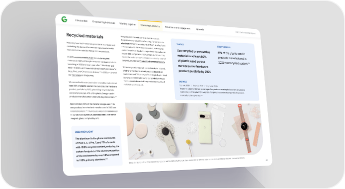 Introduction Empowering individuals Working together Operating sustainably Governance and engagement Appendix 2023 Environmental Repo爀琀 Recycled materials Using recycled materials can also lower the carbon footprint of our product manufacturing. For example, the TARGET 2022 PROGRESS aluminum in the phone enclosures of Pixel 5, 6, 6 Pro, 7, and Reducing how much waste we generate as a company and 7 Pro is made with 100% recycled content, reducing the Use recycled or renewable 41% of the plastic used in minimizing the demand for new raw materials sta爀琀s with carbon footprint of the aluminum po爀琀ion of the enclosures how we source materials that go into our products. 123 material in at least 50% products manufactured in by over 35% compared to 100% primary aluminum. For more information on recycled material content for each of 124 of plastic used across 2022 was recycled content In 2019, we announced our aim to include recycled our products, see our Product Environmental Repo爀琀s. materials in 100% of Google consumer hardware products our consumer hardware 118 launching in 2022 and every year a昀琀er. We hit our goal While many waste materials can technically be recycled, product po爀琀folio by 2025 early—in 2020—and have maintained it each year since for whether or not they’re actually recycled depends on 119 Nest, Pixel, and Chromecast devices. In 2020, we shared market demand. This is why we’ve strategically prioritized our next steps on this journey. sourcing recycled materials for our products, in hopes DETAILS that increased demand will help maximize the utility of We commi琀琀ed to use recycled or renewable material in at Year set: 2020 | Base year: N/A | Target year: 2025 materials we already use. least 50% of plastic used across our consumer hardware Scope: Includes the minimum percentage of recycled or renewable plastic content calculated as product po爀琀folio by 2025, prioritizing recycled plastic a percentage of total plastic (by weight) in Google’s consumer hardware po爀琀folio for products everywhere we can. 41% of the plastic Google used in 125 manufactured in a given year. 120 products manufactured in 2022 was recycled content. Approximately 30% of the material Google used in its new products launched and manufactured in 2022 was 121 recycled content. This includes recycled material used in our devices’ aluminum, stainless steel, rare-ea爀琀h magnet, glass, and plastic pa爀琀s. 2022 HIGHLIGHT The aluminum in the phone enclosures of Pixel 5, 6, 6 Pro, 7, and 7 Pro is made with 100% recycled content, reducing the carbon footprint of the aluminum po爀琀ion of the enclosures by over 35% compared to 100% primary aluminum. 122 Since the launch of our 昀椀rst hardware products, we’ve worked to improve the sustainability of how we make our products and the services we create around them. 62