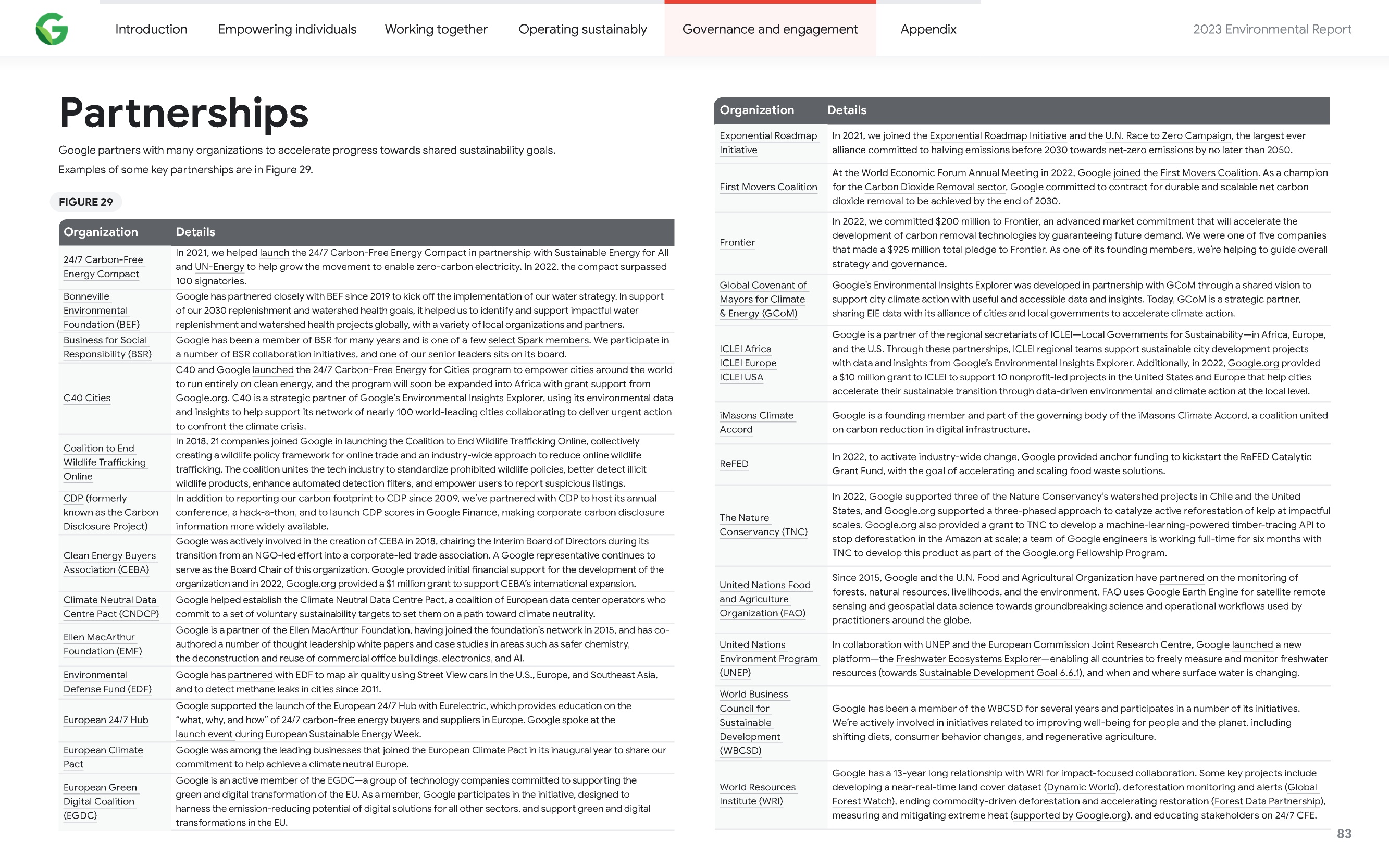Introduction Empowering individuals Working together Operating sustainably Governance and engagement Appendix 2023 Environmental Repo爀琀 Organization Details Pa爀琀nerships Exponential Roadmap In 2021, we joined the Exponential Roadmap Initiative and the U.N. Race to Zero Campaign, the largest ever Initiative alliance commi琀琀ed to halving emissions before 2030 towards net-zero emissions by no later than 2050. Google pa爀琀ners with many organizations to accelerate progress towards shared sustainability goals. Examples of some key pa爀琀nerships are in Figure 29. At the World Economic Forum Annual Meeting in 2022, Google joined the First Movers Coalition. As a champion for the Carbon Dioxide Removal sector, Google commi琀琀ed to contract for durable and scalable net carbon First Movers Coalition FIGURE 29 dioxide removal to be achieved by the end of 2030. Organization Details In 2022, we commi琀琀ed $200 million to Frontier, an advanced market commitment that will accelerate the development of carbon removal technologies by guaranteeing future demand. We were one of 昀椀ve companies Frontier that made a $925 million total pledge to Frontier. As one of its founding members, we’re helping to guide overall In 2021, we helped launch the 24/7 Carbon-Free Energy Compact in pa爀琀nership with Sustainable Energy for All 24/7 Carbon-Free strategy and governance. and UN-Energy to help grow the movement to enable zero-carbon electricity. In 2022, the compact surpassed Energy Compact 100 signatories. Google’s Environmental Insights Explorer was developed in pa爀琀nership with GCoM through a shared vision to Global Covenant of Google has pa爀琀nered closely with BEF since 2019 to kick o昀昀 the implementation of our water strategy. In suppo爀琀 Bonneville Mayors for Climate suppo爀琀 city climate action with useful and accessible data and insights. Today, GCoM is a strategic pa爀琀ner, of our 2030 replenishment and watershed health goals, it helped us to identify and suppo爀琀 impac琀昀ul water Environmental sharing EIE data with its alliance of cities and local governments to accelerate climate action. & Energy (GCoM) replenishment and watershed health projects globally, with a variety of local organizations and pa爀琀ners. Foundation (BEF) Google is a pa爀琀ner of the regional secretariats of ICLEI—Local Governments for Sustainability—in Africa, Europe, Business for Social Google has been a member of BSR for many years and is one of a few select Spark members. We pa爀琀icipate in and the U.S. Through these pa爀琀nerships, ICLEI regional teams suppo爀琀 sustainable city development projects ICLEI Africa Responsibility (BSR) a number of BSR collaboration initiatives, and one of our senior leaders sits on its board. with data and insights from Google’s Environmental Insights Explorer. Additionally, in 2022, Google.org provided ICLEI Europe C40 and Google launched the 24/7 Carbon-Free Energy for Cities program to empower cities around the world a $10 million grant to ICLEI to suppo爀琀 10 nonpro昀椀t-led projects in the United States and Europe that help cities ICLEI USA to run entirely on clean energy, and the program will soon be expanded into Africa with grant suppo爀琀 from accelerate their sustainable transition through data-driven environmental and climate action at the local level. Google.org. C40 is a strategic pa爀琀ner of Google’s Environmental Insights Explorer, using its environmental data C40 Cities and insights to help suppo爀琀 its network of nearly 100 world-leading cities collaborating to deliver urgent action iMasons Climate Google is a founding member and pa爀琀 of the governing body of the iMasons Climate Accord, a coalition united to confront the climate crisis. Accord on carbon reduction in digital infrastructure. In 2018, 21 companies joined Google in launching the Coalition to End Wildlife Tra昀케cking Online, collectively Coalition to End creating a wildlife policy framework for online trade and an industry-wide approach to reduce online wildlife In 2022, to activate industry-wide change, Google provided anchor funding to kicksta爀琀 the ReFED Catalytic Wildlife Tra昀케cking ReFED tra昀케cking. The coalition unites the tech industry to standardize prohibited wildlife policies, be琀琀er detect illicit Grant Fund, with the goal of accelerating and scaling food waste solutions. Online wildlife products, enhance automated detection 昀椀lters, and empower users to repo爀琀 suspicious listings. In 2022, Google suppo爀琀ed three of the Nature Conservancy’s watershed projects in Chile and the United In addition to repo爀琀ing our carbon footprint to CDP since 2009, we’ve pa爀琀nered with CDP to host its annual CDP (formerly States, and Google.org suppo爀琀ed a three-phased approach to catalyze active reforestation of kelp at impac琀昀ul conference, a hack-a-thon, and to launch CDP scores in Google Finance, making corporate carbon disclosure known as the Carbon The Nature scales. Google.org also provided a grant to TNC to develop a machine-learning-powered timber-tracing API to information more widely available. Disclosure Project) Conservancy (TNC) stop deforestation in the Amazon at scale; a team of Google engineers is working full-time for six months with Google was actively involved in the creation of CEBA in 2018, chairing the Interim Board of Directors during its TNC to develop this product as pa爀琀 of the Google.org Fellowship Program. transition from an NGO-led e昀昀o爀琀 into a corporate-led trade association. A Google representative continues to Clean Energy Buyers serve as the Board Chair of this organization. Google provided initial 昀椀nancial suppo爀琀 for the development of the Association (CEBA) Since 2015, Google and the U.N. Food and Agricultural Organization have pa爀琀nered on the monitoring of organization and in 2022, Google.org provided a $1 million grant