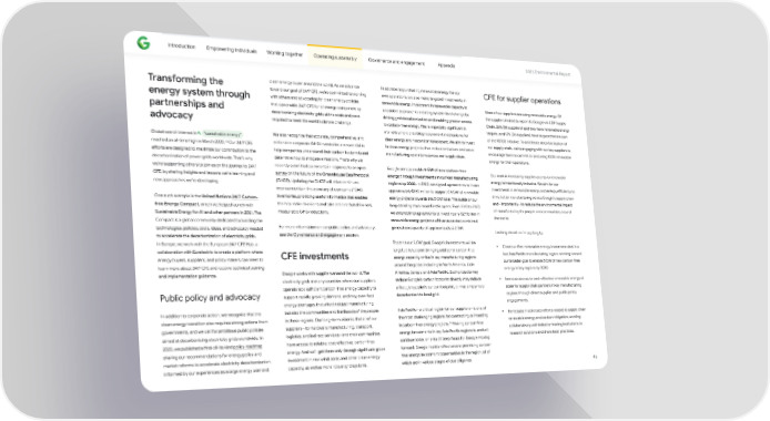 Introduction Empowering individuals Working together Operating sustainably Governance and engagement Appendix 2023 Environmental Repo爀琀 clean energy buyer around the world. As we advance In addition to purchasing renewable energy for our Transforming the CFE for supplier operations toward our goal of 24/7 CFE, we’re commi琀琀ed to working own operations, we also make targeted investments in energy system through with others and advocating for clean energy policies renewable energy. Investment in renewable capacity is More of our suppliers are using renewable energy. Of that can enable 24/7 CFE for all energy consumers by a scalable approach to creating system-level change by the suppliers invited to repo爀琀 to Google via CDP Supply pa爀琀nerships and decarbonizing electricity grids at the scale and pace driving grid decarbonization and enabling greater access Chain, 26% (58 suppliers) said they have renewable energy advocacy required to meet the world’s climate challenge. to carbon-free energy. This is especially signi昀椀cant in targets, and 12% (26 suppliers) have targets that are pa爀琀 markets where credible procurement mechanisms for of the RE100 initiative. To accelerate decarbonization of Global search interest in “sustainable energy” We also recognize that accurate, comprehensive, and clean energy are nascent or nonexistent. We aim to invest our supply chain, we’re engaging with our key suppliers to actionable corporate GHG inventories are essential to in clean energy projects that reduce emissions and serve 93 reached an all-time high in March 2022. Our 24/7 CFE encourage them to commit to procuring 100% renewable help companies understand their carbon footprints and manufacturing operations across our supply chain. e昀昀o爀琀s are designed to maximize our contribution to the energy for their operations. determine how to mitigate emissions. That’s why we decarbonization of power grids worldwide. That’s why recently submi琀琀ed comments in response to an open Google aims to enable 5 GW of new carbon-free we’re suppo爀琀ing others to join us on the journey to 24/7 survey on the future of the Greenhouse Gas Protocol energy through investments in our key manufacturing Our work in increasing supplier access to renewable CFE, by sharing insights and lessons we’re learning and (GHGP). Updating the GHGP will drive continued regions by 2030. In 2022, we signed agreements to invest energy is intentionally inclusive. We aim for our new approaches we’re developing. investments in renewable energy and energy e昀케ciency to improvements in the accuracy of companies’ GHG approximately $350 million to suppo爀琀 0.5 GW of renewable drive be琀琀er manufacturing across Google’s supply chain One such example is the United Nations 24/7 Carbon- inventories, providing useful information that enables energy projects towards this 5 GW total. This builds on our and—impo爀琀antly—to reduce the environmental impact them to make decisions and take actions that drive real, long-standing track record in this space; From 2010 to 2022, free Energy Compact, which we helped launch with of manufacturing for people and communities around measurable GHG reductions. we entered into agreements to invest nearly $2.9 billion in Sustainable Energy for All and other pa爀琀ners in 2021. The the world. renewable energy projects with an expected combined Compact is a global community dedicated to building the For more information on our public policy and advocacy, generation capacity of approximately 4.2 GW. technologies, policies, tools, ideas, and advocacy needed Looking ahead, we’re working to: see the Governance and engagement section. to accelerate the decarbonization of electricity grids. Towards our 5 GW goal, Google’s investments will be In Europe, we work with the European 24/7 CFE Hub, a • Close our 昀椀rst renewable energy investment deal in a targeted to suppo爀琀 bringing additional carbon-free collaboration with Eurelectric to create a pla琀昀orm where key Asia Paci昀椀c manufacturing region, working toward energy capacity online in key manufacturing regions CFE investments energy buyers, suppliers, and policy makers can meet to our broader goal to enable 5 GW of new carbon-free around the globe, including in No爀琀h America, Latin learn more about 24/7 CFE and receive technical training energy in key regions by 2030. America, Europe, and Asia Paci昀椀c. Such projects may Google works with suppliers around the world. The and implementation guidance. reduce Google’s carbon footprint directly, may reduce electricity grids in many countries where our suppliers • Increase access to cost-e昀昀ective renewable energy at a Google supplier’s carbon footprint, or may simply help operate lack su昀케cient carbon-free energy capacity to scale for supply chain pa爀琀ners in key manufacturing decarbonize the local grid. suppo爀琀 rapidly growing demand, and may even face regions through direct supplier and public policy Public policy and advocacy energy sho爀琀ages that a昀昀ect not just manufacturing engagements. Asia Paci昀椀c—a critical region for our suppliers—is one of but also the communities and livelihoods of the people In addition to corporate action, we recognize that the • Pa爀琀icipate in advocacy e昀昀o爀琀s related to supply chain the most challenging regions for contracting or investing in these regions. Our long-term vision is that all of our clean energy transition also requires strong actions from renewable energy and carbon mitigation, working 94 in carbon-free energy projects. Making carbon-free suppliers—for hardware manufacturing, transpo爀琀, governments, and we call for ambitious public policies collaboratively with industry-leading institutions to energy investments in key Asia Paci昀椀c regions is, and will logistics, and indirect services—and their communities aimed at decarbonizin