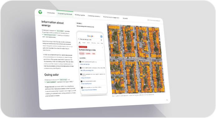 Introduction Empowering individuals Working together Operating sustainably Governance and engagement Appendix 2023 Environmental Repo爀琀 Information about FIGURE 4 energy Europe energy information panels Global search interest in “eco-anxiety” reached a 15-year high in 2022, as did search interest in how to 35 “save energy at home,” showing us that people want—and need answers. Due to the energy crisis in Europe, people, businesses, and governments across the continent are concerned about rising prices and increased pressure on the energy grid, which is evident from the information they’re searching for. In 2022, we worked with the IEA to rapidly develop a set of recommendations to help individuals reduce energy use at home. When people searched for topics such as “Europe energy crisis” and “energy price”, they saw news a爀琀icles, local information including 昀椀nancial assistance that may be available, and recommended actions to help conserve energy (see Figure 4). Going solar Global search interest in “solar energy” and 36 “solar installation” reached all-time highs in 2022. Project Sunroof, launched in 2015 in the United States and Pue爀琀o Rico, helps people decide whether to go solar. It uses AI to analyze high-resolution aerial mapping and 3D modeling of residential roofs, making estimations of solar potential faster and easier. Exploring potential solar capacity for homes in San Francisco, California in the Project Sunroof tool. 16