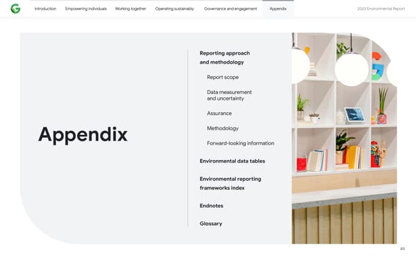 Introduction Empowering individuals Working together Operating sustainably Governance and engagement Appendix 2023 Environmental Repo爀琀 Repo爀琀ing approach and methodology Repo爀琀 scope Data measurement and unce爀琀ainty Assurance Appendix Methodology Forward-looking information Environmental data tables Environmental repo爀琀ing frameworks index Endnotes Glossary 85