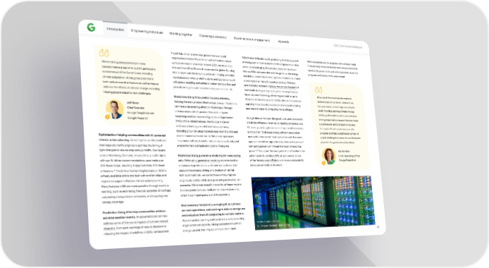 Introduction Empowering individuals Working together Operating sustainably Governance and engagement Appendix 2023 Environmental Repo爀琀 Flood Hub, which allows local governments and aid With AI at an in昀氀ection point, predicting the future growth We’re excited about the progress we’ve already made organizations to identify when a riverine 昀氀ood will occur, of energy use and emissions from AI compute in our data in developing more sustainable tools and products that up to seven days in advance. In early 2023, we expanded centers is challenging. Historically, research has shown harness the power of AI, and we’re optimistic about the We’re making advancements in many this tool from 20 to 80 countries across the globe. By using that as AI/ML compute demand has gone up, the energy progress we’ll unlock in the years ahead. transformative areas of AI, but I’m pa爀琀icularly excited about AI for Social Good, including AI to analyze satellite imagery, we’re also helping to enable needed to power this technology has increased at a much climate adaptation. AI has great potential to rapid detection when a wild昀椀re sta爀琀s and to predict how it slower rate than many forecasts predicted. We have will spread, enabling authorities to be琀琀er manage 昀椀res and used tested practices to reduce the carbon footprint of both reduce overall emissions as well as help us provide emergency ale爀琀s to individuals who are at risk. workloads by large margins; together these principles address the e昀昀ects of climate change, including have reduced the energy of training a model by up to AI is one of the most transformational helping people adapt to new challenges. Prediction: Using AI to predict locust outbreaks, 100x and emissions by up to 1,000x. We plan to continue technologies of our time. I believe it has helping farmers protect their crops. Locust infestations applying these tested practices and to keep developing the potential to unlock major bene昀椀ts for Je昀昀 Dean can have a devastating e昀昀ect on food crops. Through new ways to make AI computing more e昀케cient. us all, including tackling climate change. Chief Scientist collaborations with AI product-focused company At Google DeepMind, we’re commi琀琀ed to Google DeepMind and InstaDeep and the Food and Agriculture Organization Google data centers are designed, built, and operated to driving responsible research that can make Google Research (FAO) of the United Nations, the Google AI Center maximize e昀케ciency—even as computing demand grows. a positive and lasting impact on society. in Ghana is building a model that forecasts locust On average, a Google-owned and -operated data center I’m hopeful AI will accelerate scienti昀椀c breeding grounds using historical data from the FAO and is more than 1.5 times as energy e昀케cient as a typical progress and help us address a number of Optimization: Helping communities with AI-powered 19 environmental variables like rainfall and temperature. enterprise data center and, compared with 昀椀ve years global challenges to leave the world a be琀琀er climate action planning. Green Light is an AI-based tool This model will help to be琀琀er detect locust outbreaks and ago, we now deliver approximately three times as much place for the generations that follow. that helps city tra昀케c engineers optimize the timing of enable farmers to implement control measures. computing power with the same amount of electrical 20 light changes to reduce stop-and-go tra昀케c. Our recent power. To suppo爀琀 the next generation of fundamental Lila Ibrahim tests in Hamburg, Germany, showed that at tra昀케c lights Prediction: Using generative modeling for nowcasting advances in AI, our latest TPU v4 is proven to be one Chief Operating O昀케cer with our AI-driven recommendations, cars made over rain. We’re using generative modeling to make detailed of the fastest, most e昀케cient, and most sustainable ML Google DeepMind 25% fewer stops, resulting in approximately 10% fewer and plausible predictions, up to two hours ahead, that infrastructure hubs in the world. 18 emissions. The Environmental Insights Explorer (EIE) is capture the amount, timing, and location of rainfall. a freely available online tool built with and for cities and With such methods, we can both accurately capture regions to suppo爀琀 e昀昀ective climate action planning. large-scale events, while also generating alternative rain Many features in EIE are made possible through machine scenarios. We’re interested in the ability of these models learning, such as estimating the solar potential of roo昀琀ops, to make predictions on medium- to heavy-rain events, calculating transpo爀琀ation emissions, and mapping tree which most impact people and the economy. canopy coverage. Environmental footprint: Leveraging AI to optimize Prediction: Using AI to help communities address our own operations, and working to reduce energy use extreme weather events. AI-powered tools can help and emissions from AI computing in our data centers. address some of the worst impacts of climate-related AI and machine learning workloads are quickly becoming A row of servers in our disasters, from early warnings of natural disasters to larger and more capable, raising concerns about their St. Ghislain, Belgium, data center reducing the impact of wild昀椀res. In 2022, we launched energy use and their impact on the environment. 10