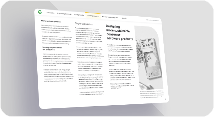 Introduction Empowering individuals Working together Operating sustainably Governance and engagement Appendix 2023 Environmental Repo爀琀 Kitchen and cafe operations Single-use plastics Designing We’re making measurable reductions across back-of- The world’s plastic pollution problem is a large and more sustainable house operations through improved culinary practices complex challenge—more than 91% of plastic isn’t and demand planning to ensure our production levels are recycled, and the majority is le昀琀 si琀琀ing in land昀椀lls or consumer consistent with user dining pa琀琀erns. 115 li琀琀ering our oceans and communities. Reducing plastic waste requires entire industries to come together and hardware products For example, in the United States, we recorded a 22%–30% take more meaningful action. At Google, that means reduction in egg waste by cooking smaller batches, and rethinking our approach to the way we source products, in India we recorded a 50% reduction in per-plate waste serve food, and reduce our waste. Our ambition is to create consumer hardware products following a multi-channel waste reduction campaign. that leave people, the planet, and our communities be琀琀er Sourcing and procurement Improving our plastics footprint isn’t as simple as not than we found them. Our consumer hardware products buying single-use plastics. To reduce single-use plastics include Pixel, Nest, Chromecast, and Fitbit devices. and excess food (upstream) and bridge the infrastructure gaps for recycling and composting (downstream), we need to Since launching our 昀椀rst hardware products, we’ve Additional progress will rely heavily on continued activate the entire food ecosystem, from manufacturers integrated sustainability considerations into materials engagement of our vendor pa爀琀ner operations teams, to distributors to waste management companies. sourcing and science, engineering and supply chain fu爀琀her enabling Googlers to join in, and expanding operations, carbon emissions reductions, waste pa爀琀nerships with municipal and community organizations We do this by working with vendors and suppliers to reduction, packaging products, and designing our to accelerate the pace of food donations and develop avoid or phase out products with single-use plastics; retail stores. compost infrastructure. rethinking how we handle, store, prepare, and serve food and beverages; and using fully recoverable We aim to increase the circularity of our hardware In 2022, to activate industry-wide change, Google materials that are recyclable or compostable. products and operations by decreasing our use of mined provided $1 million in anchor funding to kicksta爀琀 the materials and signaling our demand for a more circular ReFED Catalytic Grant Fund. The ReFED Catalytic Grant We’re piloting and scaling plastic-free processes economy in our procurement of recycled materials. This Fund provides nonpro昀椀t and for-pro昀椀t organizations with and products in our kitchens, cafes, and overall food is in addition to extending the life of our products through recoverable and non-recoverable grants to de-risk and operations. For example, we’re installing beverage so昀琀ware updates and expanded repair options. scale high-impact solutions to food waste. dispensers to replace single-use beverages. We’re rede昀椀ning what we serve—and how we serve it—to We suppo爀琀 greener electronics standards and eliminate single-use plastics and ensure durable, ce爀琀i昀椀cations, including UL 110, IEEE 1680.1, and the UL washable dishware and cutlery are easy to choose. 116 ECOLOGO Program. Looking to the future, we’re also planning to create The aluminum in the phone enclosures of Pixel 5, 6, 6 Pro, 7, food spaces that design out waste from the sta爀琀. and 7 Pro is made with 100% recycled content, reducing the carbon footprint of the aluminum po爀琀ion of the enclosures 117 by over 35% compared to 100% primary aluminum. 61
