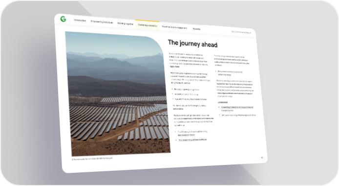 Introduction Empowering individuals Working together Operating sustainably Governance and engagement Appendix 2023 Environmental Repo爀琀 The journey ahead As we move forward on our journey to reduce our The clean energy transition also requires strong emissions, we’ll continue to focus both on our own actions from governments, and we call for ambitious footprint and on the larger systems that serve us—from public policies aimed at decarbonizing electricity grids electricity grids to transpo爀琀ation networks to materials worldwide. supply chains. • Policy recommendations to accelerate We’ve made great progress in procuring clean energy, carbon-free energy but we still have a long way to go to meet our 2030 net-zero target. We recognize we’ll face many challenges Ultimately, achieving a carbon-free future for all requires along the way, for example: rapid and far-reaching transformations to these systems, and as we grow our e昀昀o爀琀s towards net-zero emissions • Meeting our growing energy needs for our own footprint, we’ll prioritize actions where we can make unique contributions and maximize our impact on • Availability of carbon-free energy larger systems change. • Cost and limited volumes of carbon removals LEARN MORE For more details, see the Challenges to address • Accelerating climate action at Google and beyond: section above. A progress update We also know we can’t get there alone. To scale our • 24/7 carbon-free energy: Methodologies and metrics work, we’ve created tools, white papers, and case studies to help others adopt some of the approaches that have worked for us. • The CFE manager: A new model for driving decarbonization impact • Time-based energy a琀琀ribute ce爀琀i昀椀cates El Romero solar farm in Chile (80 MW for Google) 48