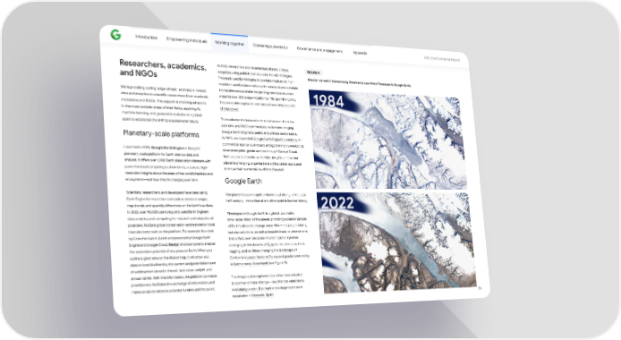 Introduction Empowering individuals Working together Operating sustainably Governance and engagement Appendix 2023 Environmental Repo爀琀 Researchers, academics, In 2022, researchers addressed urban climate change FIGURE 9 inequities using publicly available data from Ea爀琀h Engine. Glacier retreat in Sermersooq, Greenland, seen from Timelapse in Google Ea爀琀h. and NGOs This study used Ea爀琀h Engine to combine medium-to-high- resolution satellite observations with census data to calculate the feasible area available for planting new trees in urban We’re providing cu琀琀ing-edge climate- and nature-related 62 areas for over 200 areas in California. By quantifying this, data and analytics to scienti昀椀c researchers from academic 1984 they were able to provide estimates of several co-bene昀椀t institutions and NGOs. This suppo爀琀 is enabling advances of tree cover. in the most complex areas of their 昀椀elds, applying AI, machine learning, and geospatial analytics at a global scale to accelerate the shi昀琀 to a sustainable future. To accelerate the innovation that we’ve seen from the scienti昀椀c and NGO communities, we’re now bringing Google Ea爀琀h Engine to public and private sector users. Planetary-scale pla琀昀orms In 2022, we expanded Google Ea爀琀h Engine’s availability for commercial use by businesses and governments worldwide Launched in 2010, Google Ea爀琀h Engine is Google’s as an enterprise-grade service through Google Cloud. planetary-scale pla琀昀orm for Ea爀琀h science data and With access to reliable, up-to-date insights on how our analysis. It o昀昀ers over 1,000 Ea爀琀h observation datasets with planet is changing, organizations will be be琀琀er equipped powe爀昀ul cloud computing to show timely, accurate, high- to move their sustainability e昀昀o爀琀s forward. resolution insights about the state of the world’s habitats and ecosystems—and how they’re changing over time. Google Ea爀琀h Scientists, researchers, and developers have been using Our planet has seen rapid environmental change in the past Ea爀琀h Engine for more than a decade to detect changes, half-century—more than at any other point in human history. map trends, and quantify di昀昀erences on the Ea爀琀h’s su爀昀ace. 2022 In 2022, over 90,000 users regularly used Ea爀琀h Engine’s Timelapse in Google Ea爀琀h is a global, zoomable data analytics and computing for research and educational time-lapse video of the planet, providing a clearer picture purposes. Multiple global conservation and restoration tools of Ea爀琀h’s dynamic change since 1984—not just problems, have also been built on the pla琀昀orm. For example, founded but also solutions, as well as beautiful natural phenomena by Crowther Lab in Zurich and powered by Google Ea爀琀h that unfold over decades—from irrigation systems Engine and Google Cloud, Restor allows anyone to analyze emerging in the dese爀琀s of Egypt to volcanic eruptions, the restoration potential of any place on Ea爀琀h. When you logging, and wild昀椀res changing the landscape of outline a given area on the Restor map, it will show you California’s Lassen National Forest and glaciers retreating data on local biodiversity, the current and potential amount in Sermersooq, Greenland (see Figure 9). of solid carbon stored in the soil, land cover, soil pH, and annual rainfall. With this information, the pla琀昀orm connects The imagery also captures how cities have adapted practitioners, facilitates the exchange of information, and to combat climate change—like o昀昀shore wind farms makes projects visible to potential funders and the public. in Middelgrunden, Denmark and a large-scale solar installation in Granada, Spain. 26