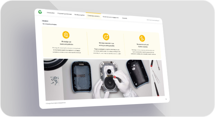 Introduction Empowering individuals Working together Operating sustainably Governance and engagement Appendix 2023 Environmental Repo็็ FIGURE 21 Our circularity principles We design out We keep materials in use We promote safe and waste and pollution as long as safely possible healthy materials We design products, workplaces, and data centers with We design for circularity from the sta็็, making it easier We pursue strategies to extend the life of our products, healthy materials that are safe for people and for the for the materials used in the creation of our products, workplaces, and data centers for as long as safely possible environment, enabling them to be safely reused in the future workplaces, and data centers to be reused in the future to maximize the use of materials that went into their creation A Google Nest Audio is disassembled. 56
