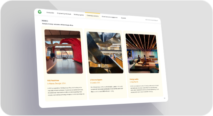 Introduction Empowering individuals Working together Operating sustainably Governance and engagement Appendix 2023 Environmental Repo爀琀 FIGURE 14 Examples of energy- and carbon-e昀케cient Google o昀케ces 1105 Peachtree 6 Pancras Square Energy audits in Atlanta, Georgia, U.S.A. in London, U.K. in Asia-Paci昀椀c In 2022, we opened our 1105 Peachtree o昀케ce, which is designed to Our 6 Pancras Square o昀케ce was the 昀椀rst building project in the world In 2022, we conducted more than 20 energy audits across our largest meet LEED v4 Gold Ce爀琀i昀椀cation. To promote low-carbon commutes, to receive ILFI Zero Carbon Ce爀琀i昀椀cation. It’s also ce爀琀i昀椀ed LEED v2009 Asia Paci昀椀c sites. As a result, we identi昀椀ed more than 200 energy it’s located near mass transit and o昀昀ers on-site bike parking. It also conservation measures that we’re now actively implementing—which Platinum and received a BREEAM Excellent rating. includes sma爀琀 building technology throughout to decrease energy use. are projected to save a total of 5,600 MWh of energy. 39