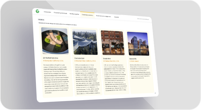 Introduction Empowering individuals Working together Operating sustainably Governance and engagement Appendix 2023 Environmental Repo爀琀 FIGURE 23 Examples of circular design and construction at our workplaces and stores 237 Mo昀昀e琀琀 Park Drive Charleston East Google store Bolands Mills in Sunnyvale, California, U.S.A. in Mountain View, California, U.S.A. in Dublin, Ireland in Chelsea, New York, U.S.A. Our newest addition to Google’s Sunnyvale In 2022, we advanced construction for our In 2021, we opened our 昀椀rst 昀氀agship retail store Our Bolands Mills o昀케ce is the reincarnation of a campus—237 Mo昀昀e琀琀 Park Drive—is the world’s Charleston East campus, with the goal of in New York City’s Chelsea neighborhood, which 150-year-old 昀氀our mill, repurposed as a workspace largest LBC Materials Petal Ce爀琀i昀椀ed Renovation expanding the boundaries of sustainable design, achieved LEED-ID+C Retail v4 Platinum status. Every for Googlers. There are plans for a public ground- Typology project. The existing building was including around healthy and reclaimed materials. element of the Google Store—the materials, building 昀氀oor food market that will reforge visitors’ transformed into a workplace that embodies Charleston East is on track to achieve LEED-NC processes, mechanical systems and more—was connection to food. With Bolands Mills, we have the regenerative design and promotes well-being. v4 Platinum ce爀琀i昀椀cation and be one of the largest painstakingly considered and selected. For example, oppo爀琀unity to preserve an iconic heritage site while Materials were given a second chance throughout new construction projects ever to a琀琀ain the LBC the veneer on the walls is a so昀琀 gray, responsibly- creating a place that will suppo爀琀 Google and the the building—from still-functioning components Materials Petal Ce爀琀i昀椀cation, which helps ensure sourced hickory, and our custom cork and wood neighborhood for years to come. of the original mechanical systems to roughly 300 the health of the building occupants, the local furniture was created with a local cra昀琀sman from interior doors made with veneer from oak trees community, and the broader supply chain. Using the Greenpoint, Brooklyn. We even a琀琀ached our salvaged from recent California wild昀椀res. In total, LBC Red List as a framework, thousands of materials carpeting (which was manufactured with recycled nearly 3,400 tons of waste (or 91% of total waste on the project went through a rigorous sourcing materials) in a sustainable way. In 2022, we opened our generated) was dive爀琀ed from land昀椀ll during its and review process. The design of Charleston East second retail location in Brooklyn, New York, which construction. also incorporates salvaged materials and Forest also earned a LEED-ID+C Retail v4 Platinum rating. Stewardship Council (FSC)-ce爀琀i昀椀ed wood products. 59