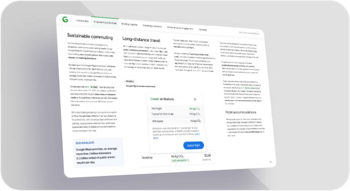 Introduction Empowering individuals Working together Operating sustainably Governance and engagement Appendix 2023 Environmental Repo爀琀 Sustainable commuting Long-distance travel “Less emissions only” 昀椀lter. In 2022, we expanded Over time, we’ve re昀椀ned and improved the TIM with help coverage of carbon emissions estimates to 99% of from academic and nonpro昀椀t expe爀琀s, as well as various itineraries on Google Flights. pa爀琀ners in the travel industry. We then formalized these One sustainable way to travel is to avoid driving When individuals search in Google Flights, they now see collaborative e昀昀o爀琀s by establishing an independent altogether, which is why we’re making it easier to use carbon emissions estimates for nearly every 昀氀ight, right We also created the Travel Impact Model (TIM), advisory commi琀琀ee to oversee future changes to the TIM. Google Maps for sustainable commuting in urban areas, next to price and duration (see Figure 6). Lower emissions a public and freely accessible methodology for predicting by providing mass transit options, bike routes, bike 昀氀ights are labeled with a green badge, and results can the per-passenger CO emissions produced by an Google Search can also help people 昀椀nd more shares, and walking directions. be so爀琀ed or 昀椀ltered by carbon impact. If people want to 2 upcoming 昀氀ight. Today, the TIM powers the emissions sustainable alternatives to 昀氀ying when available. view only 昀氀ights that have lower emissions compared to estimates you see on Google Flights, as well as select Trips taken by train or bus o昀琀en produce lower emissions By tapping on the Google Maps transit icon, individuals the average for similar trips, they can simply tap the travel sites, through our work in the Travalyst coalition. and can frequently save individuals time or money over can get directions to their destination by bus, train, sho爀琀er distances. subway, and even ferry. Google Maps provides, on average, more than 2 billion kilometers (1.2 billion miles) People can now compare train ticket prices directly on of public transit results per day. FIGURE 6 Google Search for travel in and around select countries. As Google Flights emissions estimates an example, when looking for “Berlin to Vienna trains,” Global searches for “e-bikes” have doubled over individuals will see a new module in the search results that 43 the past three years. In 2022, we added over 90,000 lets them choose their depa爀琀ure date and compare the kilometers (56,000 miles) of bike lanes and bikeable available options. To fu爀琀her expand individual choices for roads to Google Maps. Individuals can also 昀椀nd nearby intercity travel, we’ve also sta爀琀ed testing a similar feature bike and scooter shares in over 400 cities around for bus tickets. the world. We’re also helping people get from point A to point B Hotel accommodations on foot. Google Maps o昀昀ers turn-by-turn directions for pedestrians, with Immersive View and Street View When people search for travel accommodations, they o昀昀ering route previews, and Live View, which uses can see which hotels have been ce爀琀i昀椀ed for meeting augmented reality to display arrows and directions high standards of sustainability by select independent clearly overlaid on the map. organizations. For example, hotels ce爀琀i昀椀ed by Green Key or Ea爀琀hCheck will have an eco-ce爀琀i昀椀ed badge next to their name. 2022 HIGHLIGHT Google Maps provides, on average, more than 2 billion kilometers (1.2 billion miles) of public transit results per day. 18
