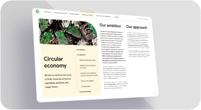 Introduction Empowering individuals Working together Operating sustainably Governance and engagement Appendix 2023 Environmental Repo爀琀 Our ambition Our approach Humans are consuming natural resources Our impact on the circular economy cuts across all our and generating waste at alarming rates. core business operations. It includes the data centers we build and operate to power our products, the workplaces We need 1.75 Ea爀琀hs to sustain our current rate of natural resource consumption, but where Googlers come together to create the next breakthrough technology, and the consumer hardware we only have one planet. 105 The circular products that people use every day. Our impact also economy aims to minimize waste and spans the entire value chain, including data centers, maximize reuse of existing materials. workplaces and stores, products, and our suppliers, and we’ve set goals to measure our progress in each area. An impo爀琀ant component of this is Our ambition promoting safer materials for human and environmental health, to maximize their Our circularity principles focus on designing out waste from the sta爀琀, keeping materials in use for as long as reuse potential. The circular economy Our approach possible, and promoting healthy materials—for our data o昀昀ers a tremendous oppo爀琀unity for centers, workplaces, and products (see Figure 21). new business and innovation, capable of Circular Reducing data center waste generating an estimated $4.5 trillion in new economic output by 2030. 106 Building circular workplaces economy The world can’t achieve net-zero carbon emissions and stores without accelerating the circular economy. Roughly 45% of global GHGs come from embodied carbon emissions, generated from creating new goods and infrastructure. 107 Designing more sustainable We aim to maximize the reuse We can reduce up to 10 GT of carbon by 2050 through consumer hardware products circular strategies, such as using recycled materials and 108 of 昀椀nite resources across our low-carbon building approaches. operations, products, and Working with suppliers To suppo爀琀 the transition to a circular economy, we aim to supply chains become a circular Google—maximizing the reuse of 昀椀nite Enabling others resources across our operations, products, and supply chains and enabling others to do the same. The journey ahead 55