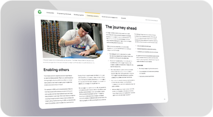 Introduction Empowering individuals Working together Operating sustainably Governance and engagement Appendix 2023 Environmental Repo爀琀 The journey ahead At Google, we believe that realizing a sustainable world The challenge is large, but so is our ambition. We seek means that we must accelerate the transition to a circular to enable others to embrace circularity, which is why we economy where people, the planet, and businesses thrive. share knowledge and insight through research, product This is a large and complex global challenge, but we’ve examples, and case studies with our pa爀琀ners, customers, always viewed a challenge as an oppo爀琀unity to be helpful and billions of users around the world. Examples include: and make things be琀琀er for everyone. • Closing the plastics circularity gap While we’re excited about our journey to a circular • Understanding barriers to electronics recycling economy, we recognize that we’ll face many challenges along the way. For example: • Accelerating commercial deconstruction and reuse • Recovering and dive爀琀ing resources from land昀椀lls Our goal with this work is to accelerate progress towards requires robust collection and recycling infrastructure a fully sustainable technology industry and real estate around the world, beyond what exists today. footprint operating on clean, e昀케ciently used energy and A Googler swaps out a motherboard at our data center in The Dalles, Oregon. When server pa爀琀s break, • The lack of 昀椀nancially healthy end markets and local made with safe and circular materials. reuse infrastructure for salvaged resources o昀琀en we 昀椀rst try to repair them. If we can’t, we break them up into raw materials and recycle the components. prevents or prohibits materials from making their way LEARN MORE back into the economy. • How Google is suppo爀琀ing the circular economy Enabling others • The circular economy requires be琀琀er data to enable markets to identify, manage, and value available • A new accelerator for circular economy sta爀琀ups resources. More and higher-quality data is needed to and nonpro昀椀ts The circular economy requires everyone to pa爀琀icipate to using AI technology for waste identi昀椀cation. Our goal inform capital investments, infrastructure priorities, • Restricted substances speci昀椀cation with CircularNet is to develop a robust and data-e昀케cient to reach its fullest potential. That’s why we’re focused on business plans, policies, and other interventions. model for waste/recyclables detection, which can suppo爀琀 sharing insights about our e昀昀o爀琀s so others can adopt • Accelerating the switch from using single-use plastics the way anyone in the waste management ecosystem can them, and why we invest in creating technologies that to more reusable solutions requires additional identify, so爀琀, manage, and recycle materials. enable everyone to have an impact. innovation with the potential to scale across large real estate po爀琀folios. We also suppo爀琀 our pa爀琀ners to help discover, accelerate, For example, in 2022, we introduced product features and scale ecosystem solutions that can bene昀椀t everyone • We’re exploring the connection between low-GHG that help people and businesses recycle clothing and tackling waste and reuse challenges. In 2022 and early construction materials and the circular economy, other goods, and that help hardware customers keep 2023, we worked to jumpsta爀琀 pa爀琀ner innovation by recognizing that recycled materials o昀琀en have lower their products in use longer. We’re also helping to improve 133 launching multiple accelerators focused on circular carbon footprints than virgin resources. recycling through accurate measurement and data-led economy solutions. Additional details can be found in the insights using machine learning. In 2022, we shared details Working together and Empowering individuals sections. about CircularNet, a set of models that lowers barriers 66
