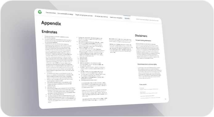 Executive le琀琀ers Our sustainability strategy Targets and progress summary Emerging oppo爀琀unities Awards and recognition Appendix 2023 Environmental Repo爀琀: Executive Summary Appendix Disclaimers Endnotes another. Similarly, emissions reductions in one area can sometimes lead 12 For products launched in 2022: Pixel, Nest, and Chromecast devices are 1 Throughout this report, we use the term “sustainability” to refer to Forward-looking information to increases in another. These are difficult effects to control for, but they made with recycled materials ranging between 9% and 60% based on environmental sustainability. must be considered when estimating enabled emissions reductions. respective product weights. 2 Our partners include governments and intergovernmental organizations; References to information in this report should not be construed as a 13 Unique, signed-in Google users that were provided information to make a customers and commercial partners; and researchers, academics, and Inherent uncertainty: Uncertainty is inherent to most GHG accounting characterization regarding the materiality of such information to our financial more sustainable choice by at least one sustainable product feature. non-governmental organizations. results or our operations. While certain matters discussed in this report may be methodologies and results, and it increases when considering enabled 14 Due to a methodology change, we’re not reporting a percent progress 3 Google uses a high-quality ML prediction model to estimate the significant, any significance should not be read as necessarily rising to the level expected fuel or energy consumption for each route option when users towards this target and have instead provided our total GHG emissions emissions reductions due to a lack of primary data and precise information of materiality used for the purposes of complying with applicable securities laws about real-world actions and their effects. However, understanding (Scope 1, 2 (market-based), and 3) in 2022. request driving directions. We identify the route that we predict will and regulations. The information in this report may contain projections, future the sources, types, and magnitude of uncertainty is crucial to deploy 15 In 2022, we expanded our carbon-free energy reporting from only consume the least amount of fuel or energy. If this route isn’t already estimates, plans, expectations, goals, and other forward-looking statements. the fastest one and it offers meaningful energy and fuel savings with Google-owned and -operated data centers to also incorporate offices and conservative estimates, inform improved data inputs, and properly Forward-looking statements are based on current expectations and assumptions interpret results. third-party data centers. The 2022 CFE number represents a 2% change only a small increase in driving time, we recommend it to the user. To that are subject to certain risks and uncertainties, which could cause our from 2021 (66% CFE), as a result of including third-party data centers. calculate enabled emissions reductions, we tally the fuel usage from actual results to differ materially from those reflected in the forward-looking 16 the chosen fuel-efficient routes and subtract it from the predicted fuel Based on Google Trends data as of December 2022, when comparing statements. Except as required by law, we undertake no obligation to correct, consumption that would have occurred on the fastest route without global Google Search interest since 2004. revise, or update any information included in this report. 17 See endnote 3 above. eco-friendly routing and apply adjustments for factors such as: CO2e 18 See endnote 9 above. factors, fleet factors, well-to-wheels factors, and powertrain mismatch 19 See endnote 10 above. factors. We then input the estimated prevented emissions into the EPA’s 20 See endnote 11 above. Greenhouse Gas Equivalencies Calculator to calculate equivalent cars 21 Based on Google’s analysis of traffic patterns before and after off the road for a year. The 2022 figure covers estimated emissions Data measurement and unce爀琀ainty recommended adjustments to traffic signals that were implemented prevented after eco-friendly routing was launched, from October 2021 during tests conducted in 2022. through December 2022. Enabled emissions reductions estimates include 22 According to Google’s own analysis of our more efficient servers, power inherent uncertainty due to factors that include the lack of primary data All reported values represent the best available data at the time of publication. infrastructure, and cooling systems, compared with data center industry and precise information about real-world actions and their effects. These Where actual data was not available, we may use estimates. We base our averages. factors contribute to a range of possible outcomes, within which we report estimates and methodologies on historical experience, available information, and 23 According to Google’s platform-neutral measurement for central a central value. on various other assumptions that we believe to be reasonable. All environmental 4 This estimated spend is based on contracts signed to purchase clean processing unit (CPU) resources analyzed over a five-year period. data found in this report is subject to measurement uncertainties resulting 24 For more information on how we’re reducing the environmental footprint energy for our operations. Actual spend may vary from these estimates from limitations inherent in the nature and the methods used for determining based on changes in renewable electricity output from operational of our operations, see the Operating sustainably section. such data. The selection of different but acceptable measurement techniques 25 “Japan’s Greenhouse Gas Emissions Rose 2% in FY21/22 as Economy projects, the number of contracts signed, and energy market prices. can result in materially different measurem