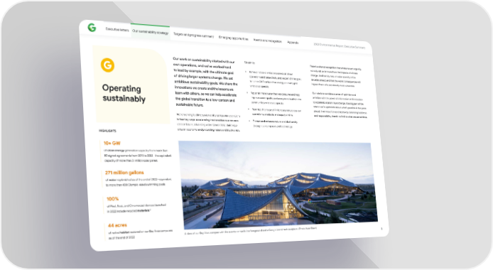 Executive le琀琀ers Our sustainability strategy Targets and progress summary Emerging oppo爀琀unities Awards and recognition Appendix 2023 Environmental Repo爀琀: Executive Summary We aim to: There’s a shared recognition that unless we act urgently, Our work on sustainability sta爀琀ed with our own operations, and we’ve worked hard nobody will be immune from the impacts of climate to lead by example, with the ultimate goal • Achieve net-zero emissions across all of our change, biodiversity loss, or water scarcity in the of driving larger systems change. We set operations and value chain, and, as pa爀琀 of that goal, decades ahead, and that the worst consequences will to run on 24/7 carbon-free energy on every grid impact those who are already most vulnerable. ambitious sustainability goals. We share the where we operate. innovations we create and the lessons we Our role is to combine a sense of optimism and Operating learn with others, so we can help accelerate • Replenish more water than we consume and help ambition with the power of information and innovation improve water quality and ecosystem health in the the global transition to a low-carbon and to accelerate system-level change. It’s a big pa爀琀 of the communities where we operate. reason we’re optimistic about what’s possible in the years sustainably sustainable future. • Maximize the reuse of 昀椀nite resources across our ahead. If we move forward decisively, balancing boldness operations, products, and supply chains. and responsibility, there’s no limit to what we can achieve. We’re working to drive sustainability across our operations in four key ways: accelerating the transition to a net-zero • Protect and enhance nature and biodiversity carbon future, advancing water stewardship, building a through our campuses and technology. circular economy, and protecting nature and biodiversity. HIGHLIGHTS 10+ GW of clean energy generation capacity from more than 80 signed agreements from 2010 to 2022—the equivalent capacity of more than 31 million solar panels 271 million gallons of water replenished as of the end of 2022—equivalent to more than 400 Olympic-sized swimming pools 100% of Pixel, Nest, and Chromecast devices launched 12 in 2022 include recycled materials 44 acres of native habitat restored on our Bay Area campuses as of the end of 2022 A view of our Bay View campus with the events center in the foreground and a Google brandmark sculpture. (Photo: Iwan Baan) 8