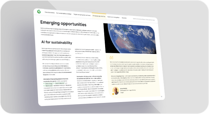 Executive le琀琀ers Our sustainability strategy Targets and progress summary Emerging oppo爀琀unities Awards and recognition Appendix 2023 Environmental Repo爀琀: Executive Summary Emerging oppo爀琀unities As the world becomes increasingly aware of the need for sustainability, individuals, businesses, and communities are looking for new ways to reduce their environmental impact. A爀琀i昀椀cial intelligence (AI) and the power of information to help individuals and organizations reduce emissions are two emerging oppo爀琀unities that Google is focusing on to help build a more sustainable future. AI for sustainability Seven years into our journey as an AI-昀椀rst company, we’ve estimated carbon emissions since launch—equivalent to made AI foundational to every pa爀琀 of our business and taking approximately 250,000 fuel-based cars o昀昀 the Our planet, as seen via Google Ea爀琀h ©2020 Landsat / Copernicus 17 all Google products. Our approach to AI must be both road for a year. bold and responsible. To us, that means developing AI in a way that maximizes the positive bene昀椀ts to society while Additionally, for over a decade, our Nest Learning addressing the challenges, guided by our AI Principles. Thermostats have used machine learning (ML) to help people save energy and money at home. From 2011 We believe that AI is a foundational and transformational technology that will provide compelling and helpful We can use AI to help accelerate solutions to tackle to 2022, Nest thermostats have helped customers bene昀椀ts to people and society through its capacity to assist, complement, empower, and inspire people in climate change by providing be琀琀er information to cumulatively save more than 113 billion kWh of almost every 昀椀eld of human endeavor. It has the potential to contribute to tackling some of society’s most 18 individuals, operational optimization for organizations, energy —more than double Po爀琀ugal’s annual electricity pressing challenges and oppo爀琀unities—among these, climate and sustainability, where we’re researching 19 and improved prediction and forecasting. We must consumption and equivalent to avoiding an estimated and innovating to help unlock scienti昀椀c discoveries and to assist people in making informed choices and 20 also continue to 昀椀nd ways to reduce the environmental 36 million tCO e emissions. 2 communities impacted by climate change. footprint of AI models. Optimization: Bringing carbon-e昀케cient computing We believe that ge琀琀ing AI right—which to us involves innovating and delivering widely accessible bene昀椀ts to Information: Empowering people to live more to customers and pa爀琀ners. We’ve made signi昀椀cant people and society, while mitigating its risks—must be a collective e昀昀o爀琀 involving us and others, including sustainably through AI. In 2022, searches for investments in cleaner cloud computing by making our researchers, developers, users (individuals, businesses, and other organizations), governments, regulators, “solar energy,” “electric bicycles,” and data centers some of the most e昀케cient in the world and and citizens. It’s critical that we collectively earn public trust if AI is to deliver on its potential for people and 16 “electric cars” reached all-time highs. People are sourcing more carbon-free energy. We’re helping our society. As a company, we embrace the oppo爀琀unity to work with others to get AI right. interested in how to live more sustainably, and our goal customers make real-time decisions to reduce emissions, is to make it easier for them to do so. Features like eco- and mitigate climate risks with data and AI. For example, James Manyika friendly routing in Google Maps leverage AI to help people Google Cloud customers can reduce their cloud footprint SVP, Research, Technology, & Society get to their destinations as quickly as possible while with a feature called Active Assist, which uses machine Google minimizing fuel or ba琀琀ery consumption. Eco-friendly learning to identify unused (and potentially wasteful) routing has helped prevent 1.2 million metric tons of workloads that could reduce carbon emissions if removed. 10