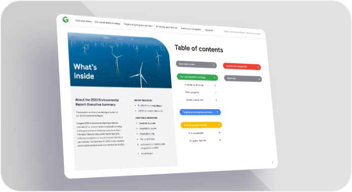 Executive le琀琀ers Our sustainability strategy Targets and progress summary Emerging oppo爀琀unities Awards and recognition Appendix 2023 Environmental Repo爀琀: Executive Summary Table of contents Executive le琀琀ers 3 Awards and recognition 13 What’s Our sustainability strategy 5 Appendix 14 inside Empowering individuals 6 Working together 7 Operating sustainably 8 About the 2023 Environmental REPORT RESOURCES Repo爀琀: Executive Summary • Full 2023 Environmental Repo爀琀 This executive summary is an abridged version of • 2023 Environmental data tables Targets and progress summary 9 our 2023 Environmental Repo爀琀. ADDITIONAL RESOURCES Google’s 2023 Environmental Repo爀琀 provides an • Sustainability.google overview of our environmental sustainability strategy Emerging oppo爀琀unities 10 • Sustainability repo爀琀s 1 and targets and our annual progress towards them. This repo爀琀 features data, pe爀昀ormance highlights, • Sustainability blog AI for sustainability 10 and progress against our targets from our 2022 昀椀scal • Our commitments year (January 1 to December 31, 2022). It also mentions Our gigaton aspiration 12 some notable achievements from the 昀椀rst half of 2023. • Alphabet environmental, social, and governance (ESG) • About Google 2