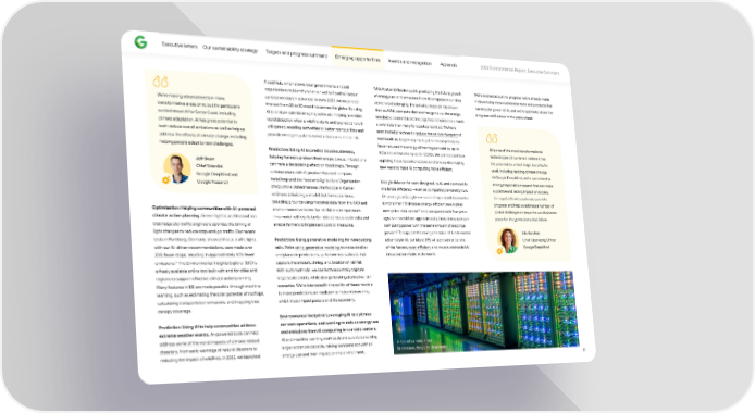 Executive le琀琀ers Our sustainability strategy Targets and progress summary Emerging oppo爀琀unities Awards and recognition Appendix 2023 Environmental Repo爀琀: Executive Summary Flood Hub, which allows local governments and aid With AI at an in昀氀ection point, predicting the future growth We’re excited about the progress we’ve already made organizations to identify when a riverine 昀氀ood will occur, of energy use and emissions from AI compute in our data in developing more sustainable tools and products that up to seven days in advance. In early 2023, we expanded centers is challenging. Historically, research has shown harness the power of AI, and we’re optimistic about the We’re making advancements in many this tool from 20 to 80 countries across the globe. By using that as AI/ML compute demand has gone up, the energy progress we’ll unlock in the years ahead. transformative areas of AI, but I’m pa爀琀icularly AI to analyze satellite imagery, we’re also helping to enable needed to power this technology has increased at a much excited about AI for Social Good, including climate adaptation. AI has great potential to rapid detection when a wild昀椀re sta爀琀s and to predict how it slower rate than many forecasts predicted. We have will spread, enabling authorities to be琀琀er manage 昀椀res and used tested practices to reduce the carbon footprint of both reduce overall emissions as well as help us provide emergency ale爀琀s to individuals who are at risk. workloads by large margins; together these principles address the e昀昀ects of climate change, including have reduced the energy of training a model by up to AI is one of the most transformational helping people adapt to new challenges. Prediction: Using AI to predict locust outbreaks, 100x and emissions by up to 1,000x. We plan to continue technologies of our time. I believe it has helping farmers protect their crops. Locust infestations applying these tested practices and to keep developing the potential to unlock major bene昀椀ts for Je昀昀 Dean can have a devastating e昀昀ect on food crops. Through new ways to make AI computing more e昀케cient. us all, including tackling climate change. Chief Scientist collaborations with AI product-focused company At Google DeepMind, we’re commi琀琀ed to Google DeepMind and Google Research InstaDeep and the Food and Agriculture Organization Google data centers are designed, built, and operated to driving responsible research that can make (FAO) of the United Nations, the Google AI Center maximize e昀케ciency—even as computing demand grows. a positive and lasting impact on society. in Ghana is building a model that forecasts locust On average, a Google-owned and -operated data center I’m hopeful AI will accelerate scienti昀椀c breeding grounds using historical data from the FAO and is more than 1.5 times as energy e昀케cient as a typical progress and help us address a number of 22 Optimization: Helping communities with AI-powered environmental variables like rainfall and temperature. enterprise data center and, compared with 昀椀ve years global challenges to leave the world a be琀琀er climate action planning. Green Light is an AI-based tool This model will help to be琀琀er detect locust outbreaks and ago, we now deliver approximately three times as much place for the generations that follow. that helps city tra昀케c engineers optimize the timing of enable farmers to implement control measures. computing power with the same amount of electrical 23 light changes to reduce stop-and-go tra昀케c. Our recent power. To suppo爀琀 the next generation of fundamental Lila Ibrahim tests in Hamburg, Germany, showed that at tra昀케c lights Prediction: Using generative modeling for nowcasting advances in AI, our latest TPU v4 is proven to be one Chief Operating O昀케cer with our AI-driven recommendations, cars made over rain. We’re using generative modeling to make detailed of the fastest, most e昀케cient, and most sustainable ML Google DeepMind 25% fewer stops, resulting in approximately 10% fewer and plausible predictions, up to two hours ahead, that infrastructure hubs in the world. 21 emissions. The Environmental Insights Explorer (EIE) is capture the amount, timing, and location of rainfall. a freely available online tool built with and for cities and With such methods, we can both accurately capture regions to suppo爀琀 e昀昀ective climate action planning. large-scale events, while also generating alternative rain Many features in EIE are made possible through machine scenarios. We’re interested in the ability of these models learning, such as estimating the solar potential of roo昀琀ops, to make predictions on medium- to heavy-rain events, calculating transpo爀琀ation emissions, and mapping tree which most impact people and the economy. canopy coverage. Environmental footprint: Leveraging AI to optimize Prediction: Using AI to help communities address our own operations, and working to reduce energy use extreme weather events. AI-powered tools can help and emissions from AI computing in our data centers. address some of the worst impacts of climate-related AI and machine learning workloads are quickly becoming disasters, from early warnings of natural disasters to A row of servers in our larger and more capable, raising concerns about their St. Ghislain, Belgium, data center reducing the impact of wild昀椀res. In 2022, we launched energy use and their impact on the environment. 11